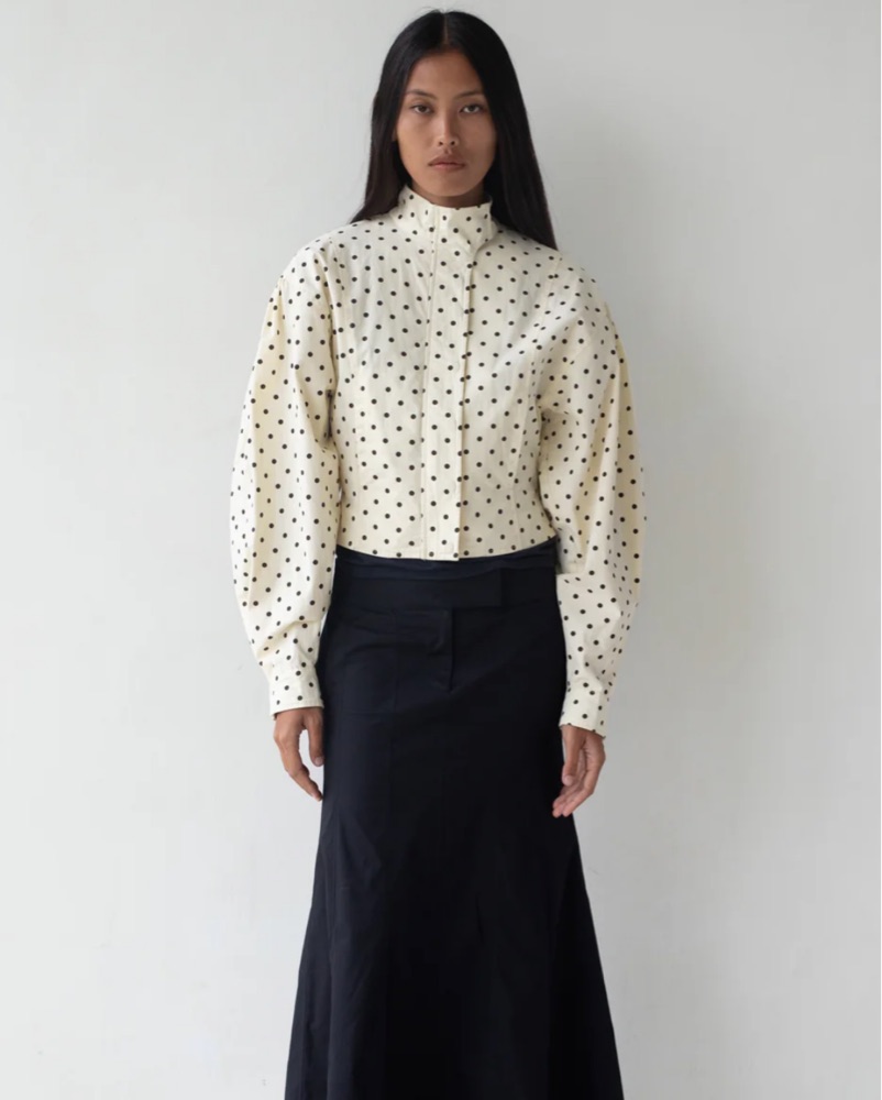 The Globo Jacket features a dual zip and snap closure, voluminous sleeve, front pockets, soft cotton lining, and a tailored bodice.
