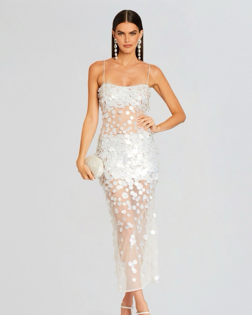 Shimmer and shine in the Mischa Dress. This dazzling creation is adorned with iridescent sequins that catch the light with every move. Its sleek silhouette and sheer detailing exude modern glamour, making it an unforgettable choice for your next special occasion. Shown here in Ivory. NO SPRAY TANS