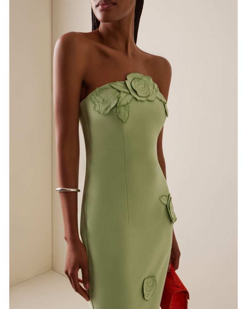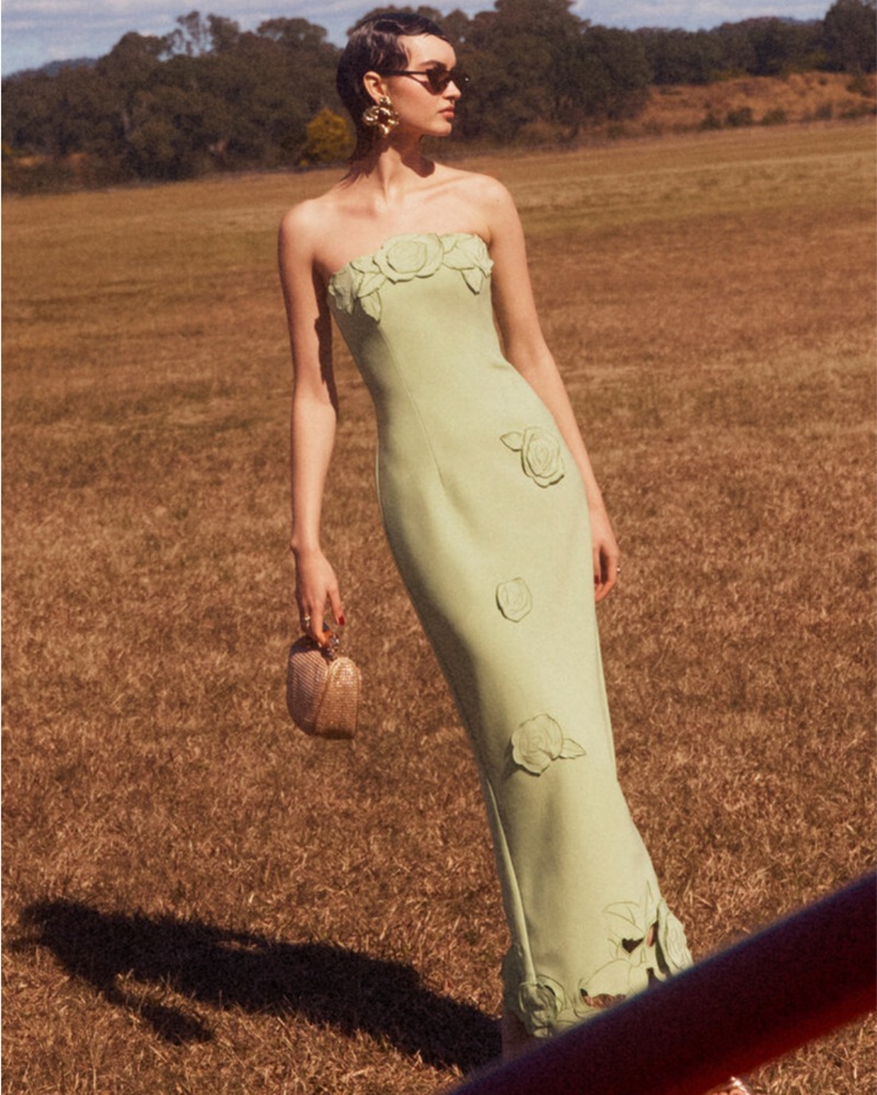 This stunning strapless maxi dress is perfect for a formal event or special occasion. The floral details and elegant silhouette create a romantic, sophisticated look.
