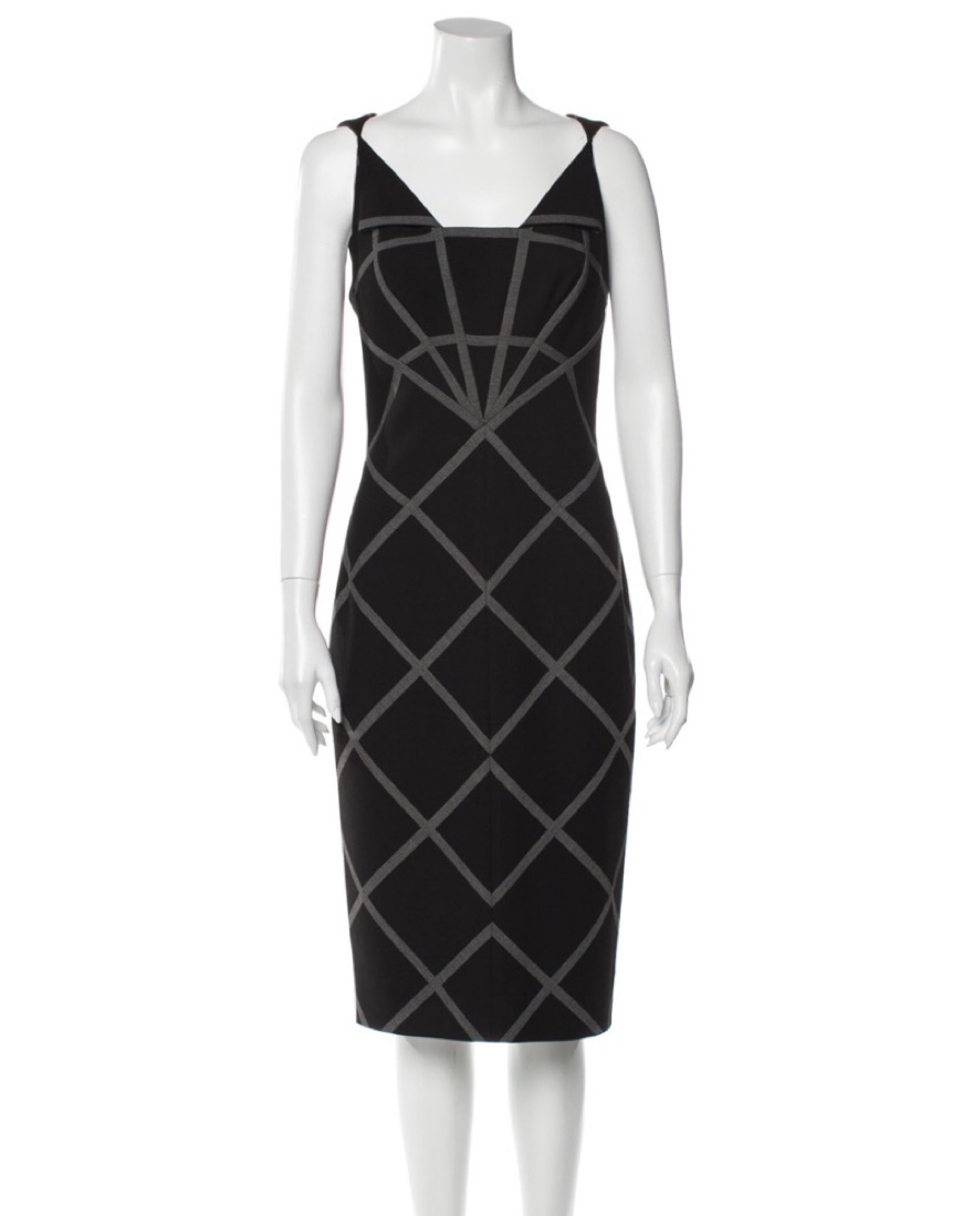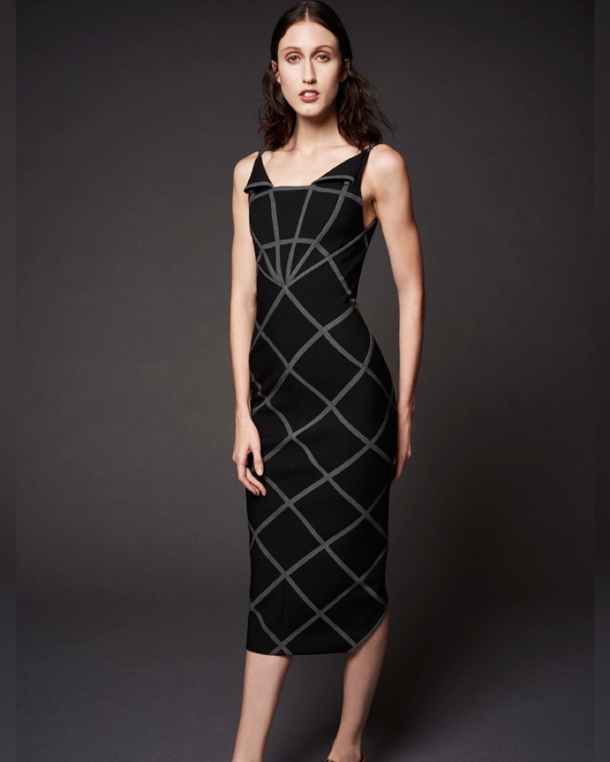 Black Zac Posen dress, with grid motif throughout. The dress is from the brand’s Resort 2017 collection.