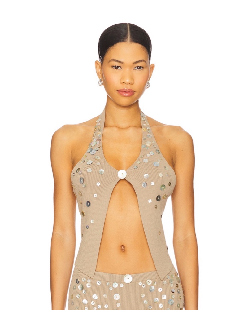 This striking halter top is perfect for a glamorous night out. The allover rhinestone and sequin embellishments add a sparkling touch.