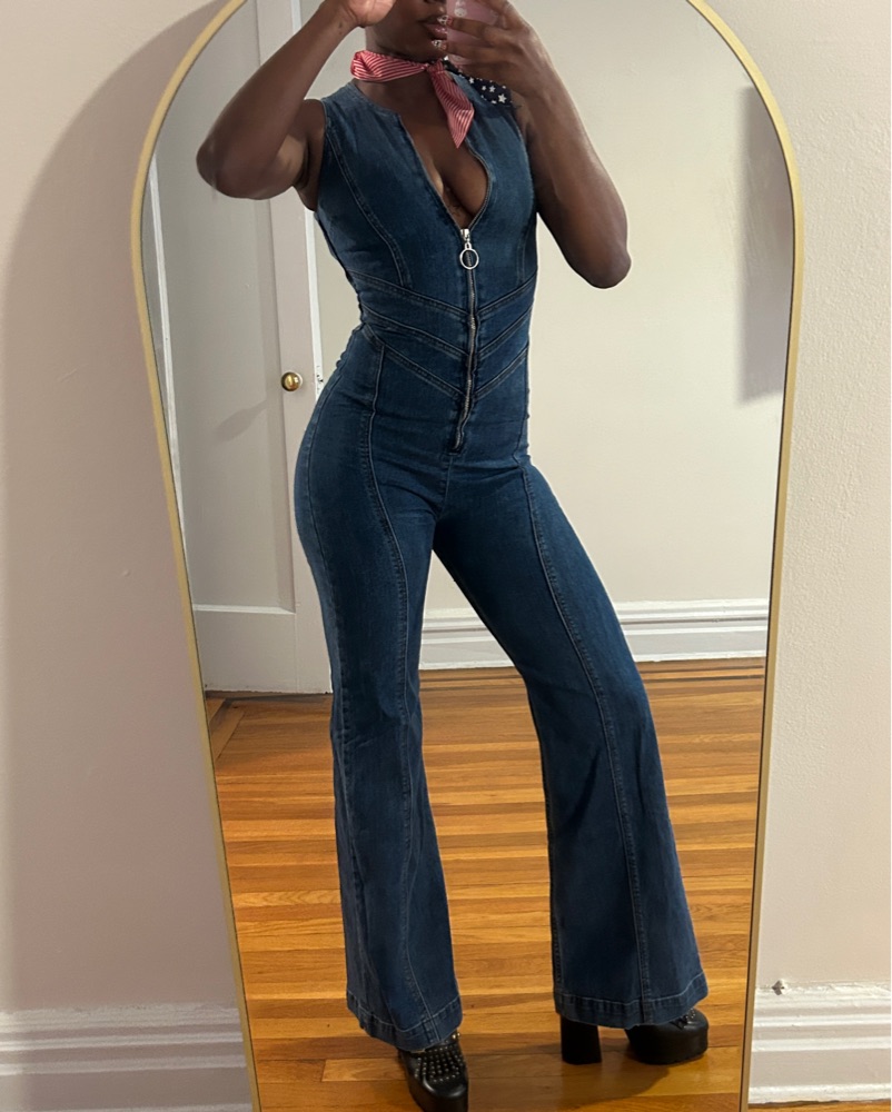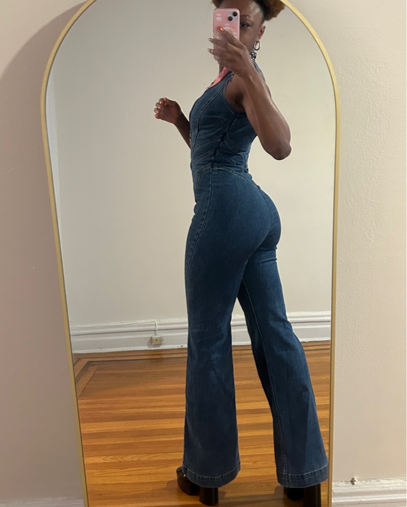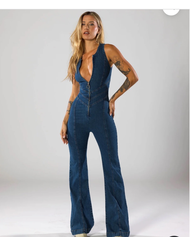 This denim jumpsuit is perfect for a night out or a special occasion. The backless detail adds a touch of glamour and the flared legs create a flattering silhouette.