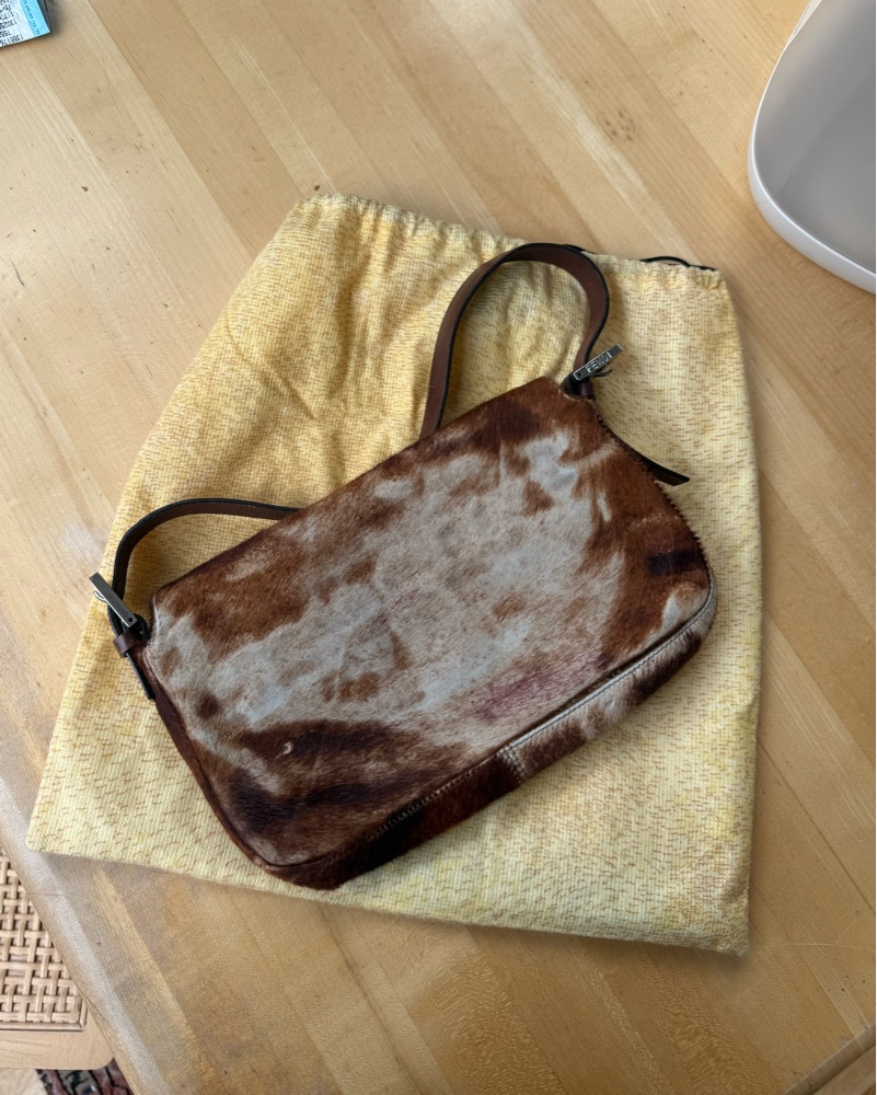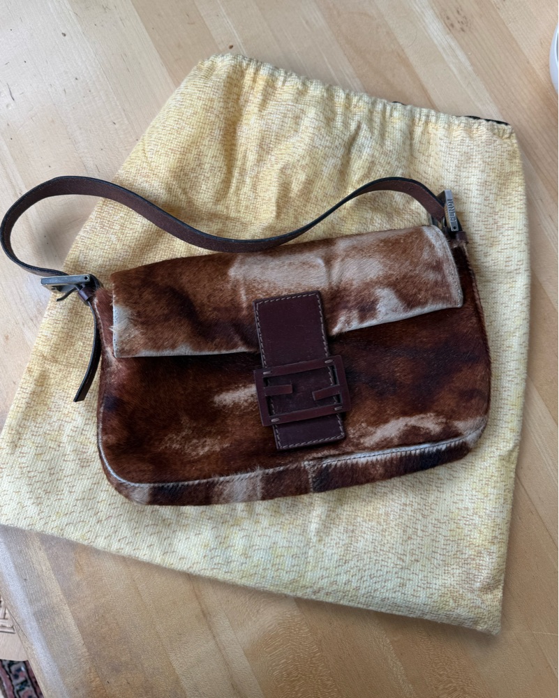 Please see photo for balding on back side. Can’t tell when wearing but wanted to note! Authentic FENDI pony calf hair brown / tan baguette. Rare.