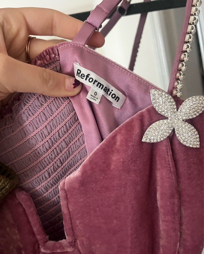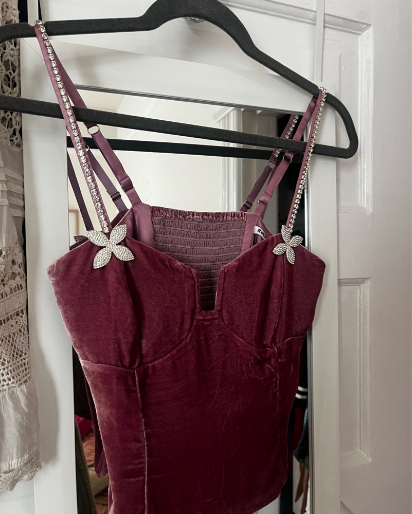 This Reformation velvet top is perfect for a glamorous night out. The sparkling crystal-embellished straps add a touch of elegance.