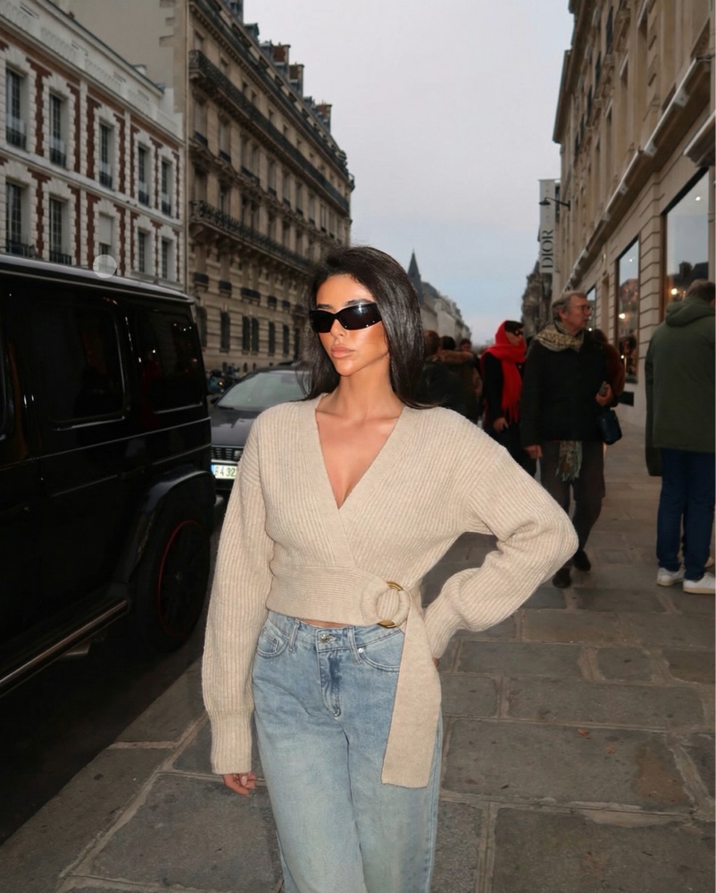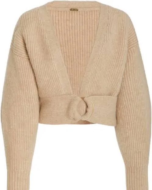 Open front with gold-tone ring buckle fastening Heavy-weight rib knit fabric