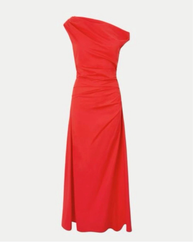 Sold out online. Draped shoulder and fitted waist, crafted in stretch poplin. Easy to dress up or down. Not hemmed, 5’2 and worn with 6 inch heels. 98% cotton, 2% spandex. Please do not rent if too long. Perfect wedding guest dress!
