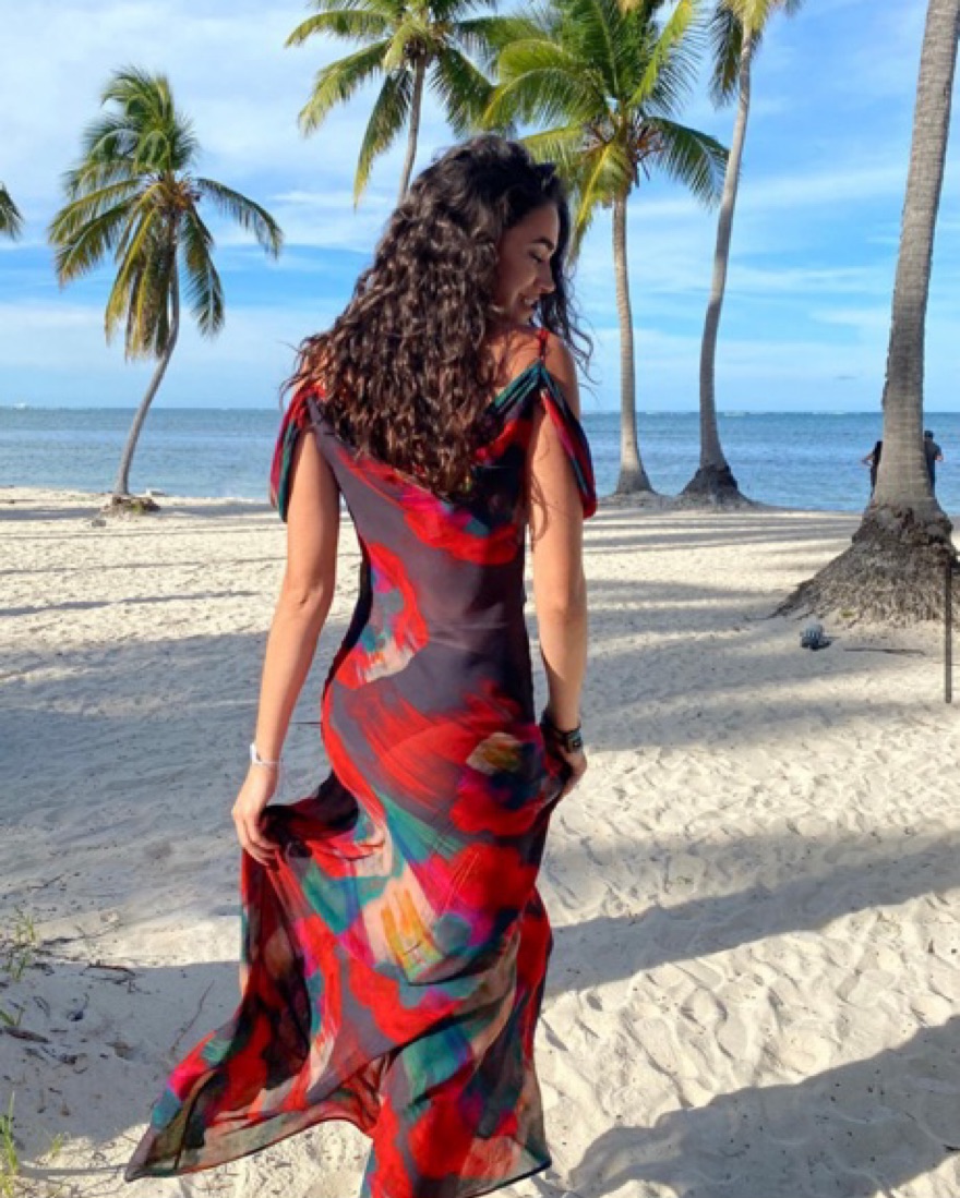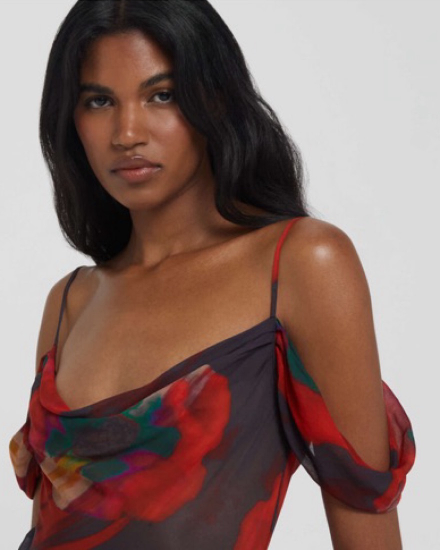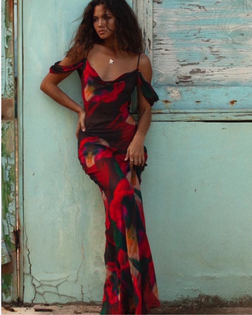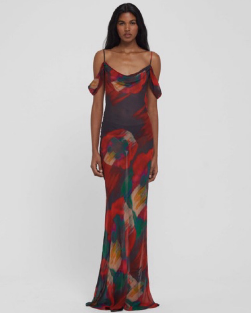 Only worn once! Like New Condition. Adjustable straps Cowl front and back Floor length Sleeve detail Abstract floral print Semi sheer 100% Viscose