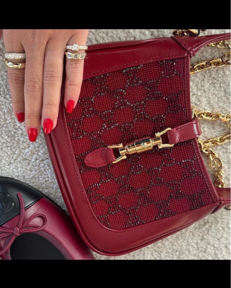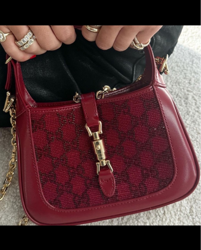 Jackie 1961's recognizable shape is enhanced with red GG crystals, red leather trim, and gold toned hardware. Mini size: 7.5"W x 5.1"H x 1.2"D