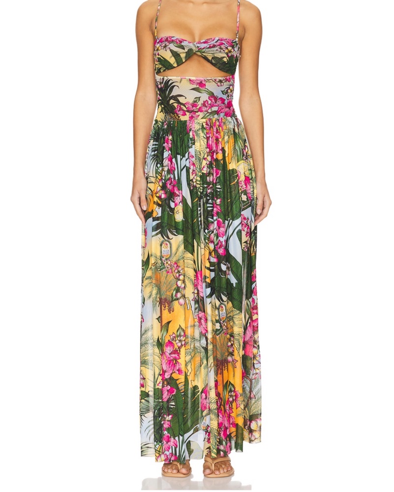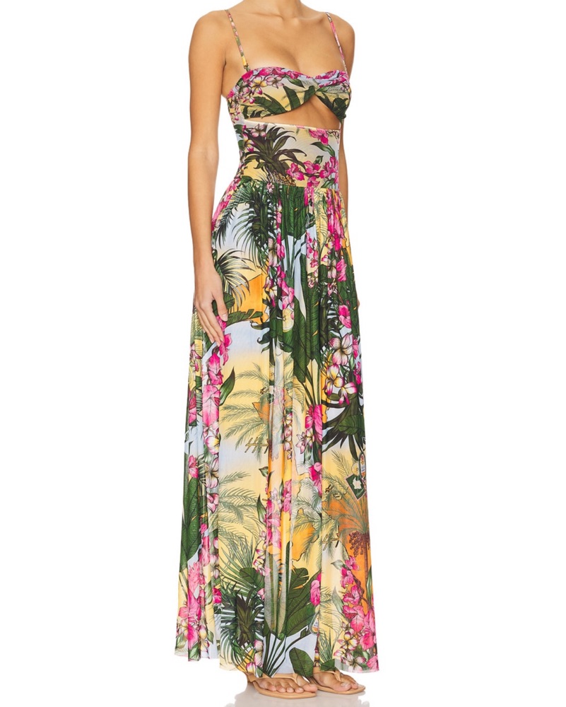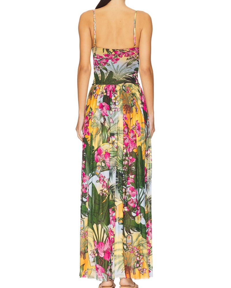 This vibrant maxi dress features a stunning tropical floral print that is perfect for a beach vacation or summer event.