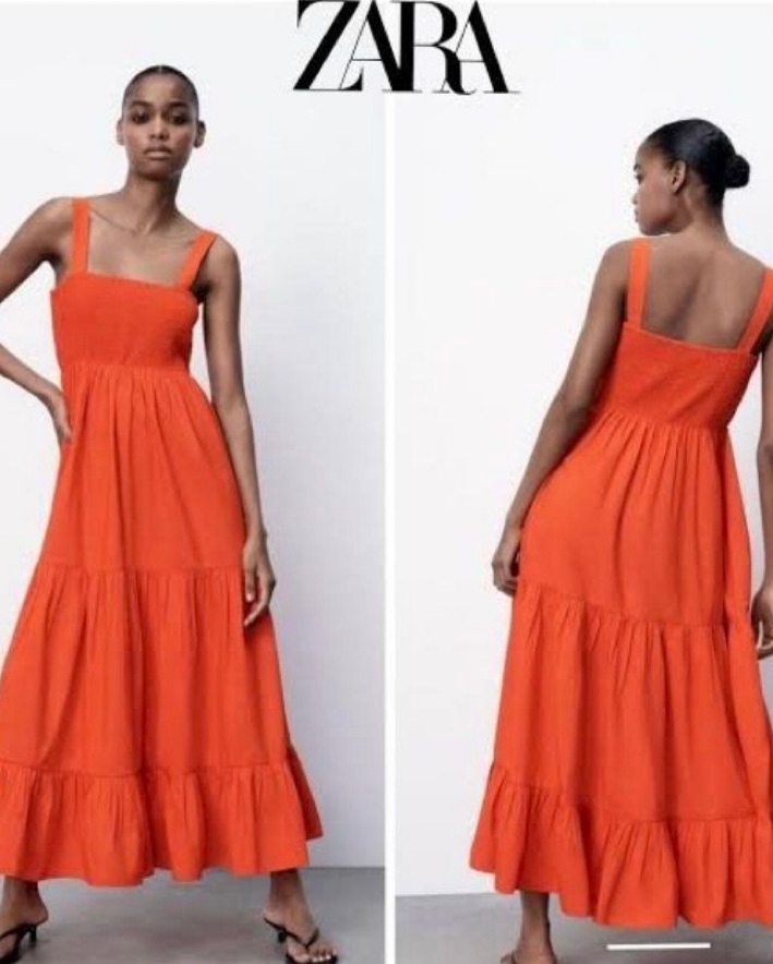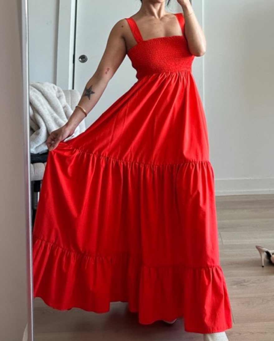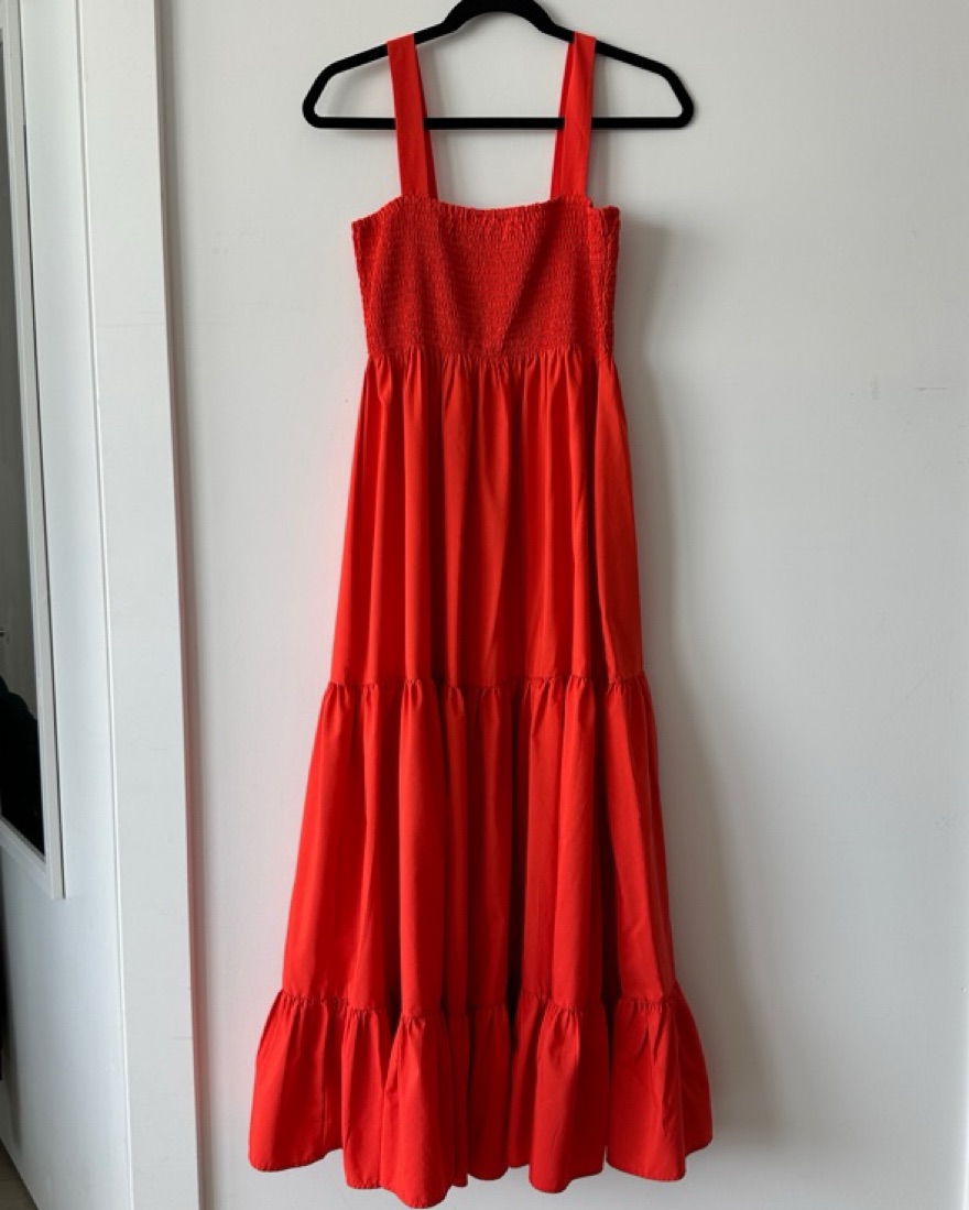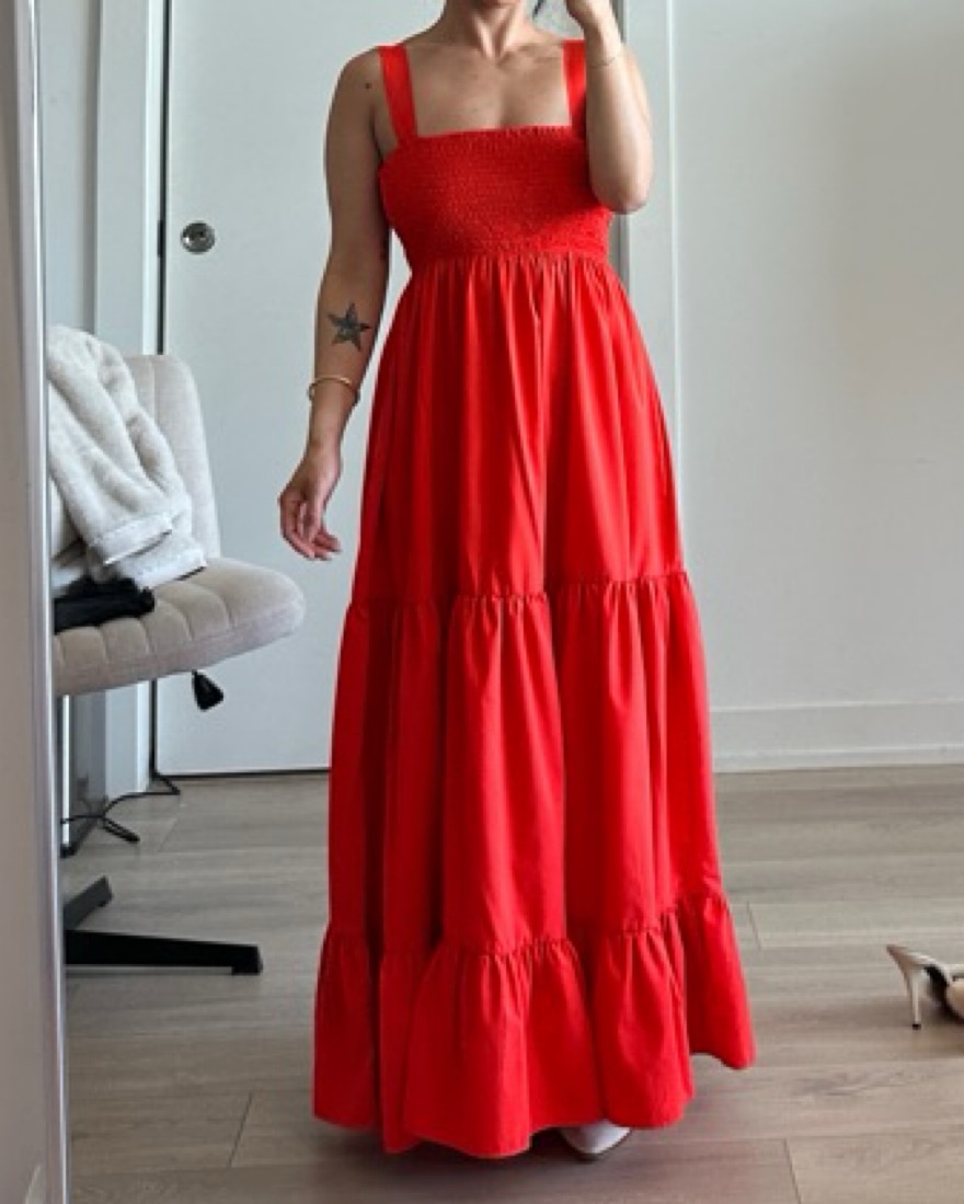 Fun summer dress! I’m 5’0” and can wear this with sandals and its not dragging on the floor. :) Size Small, but the bust is stretchy enough to comfortably fit Medium.
