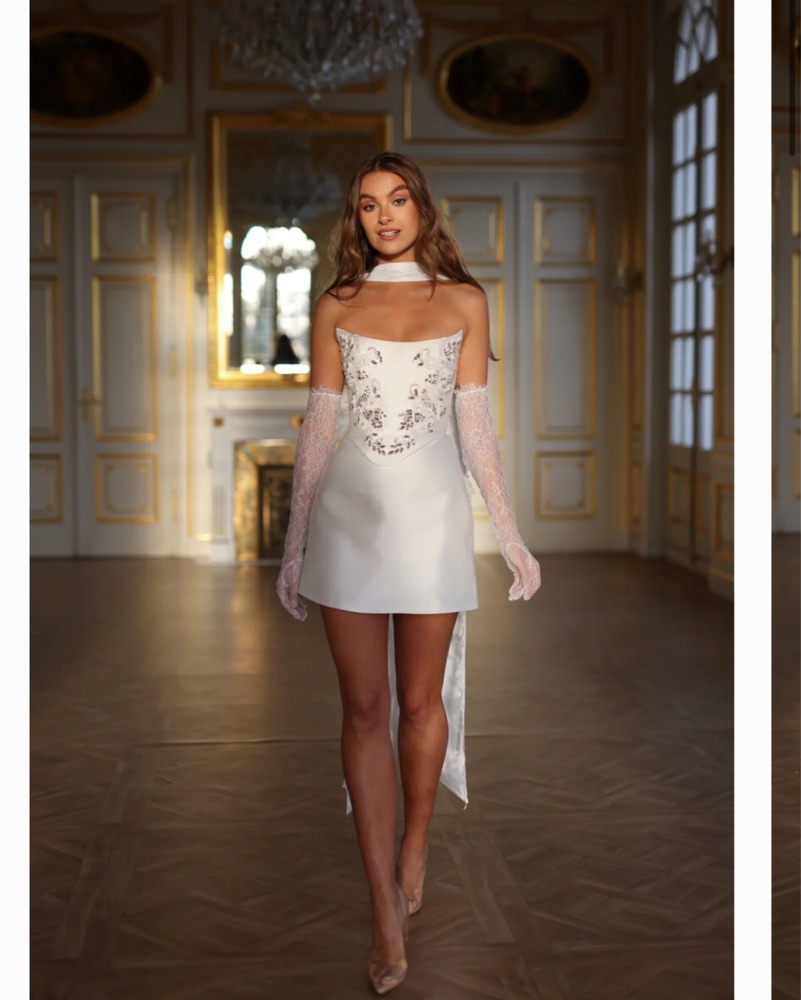 Design: Strapless mini dress with floral lace embellishments