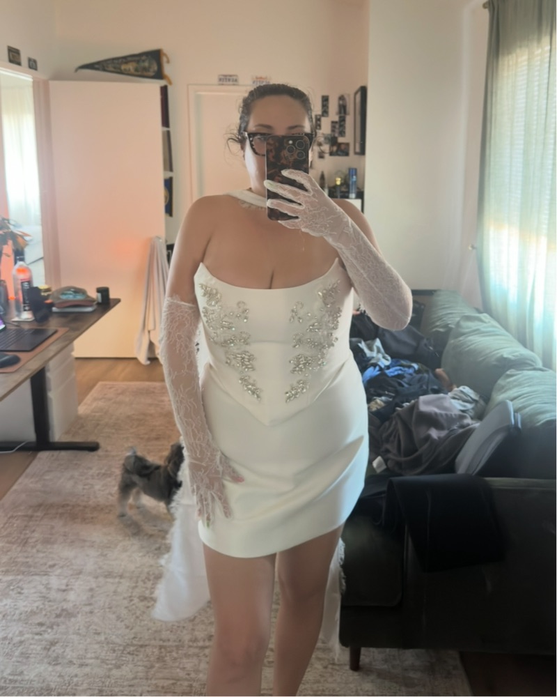 Detailing: Matching lace gloves and satin lace neck scarf