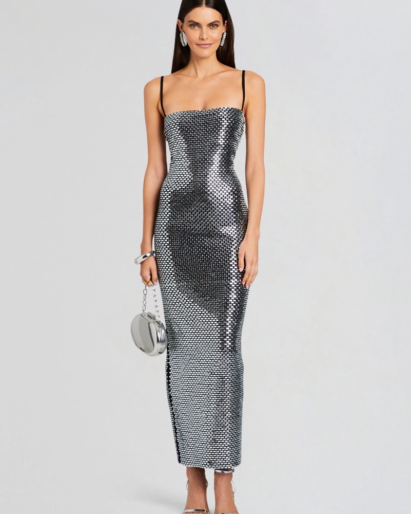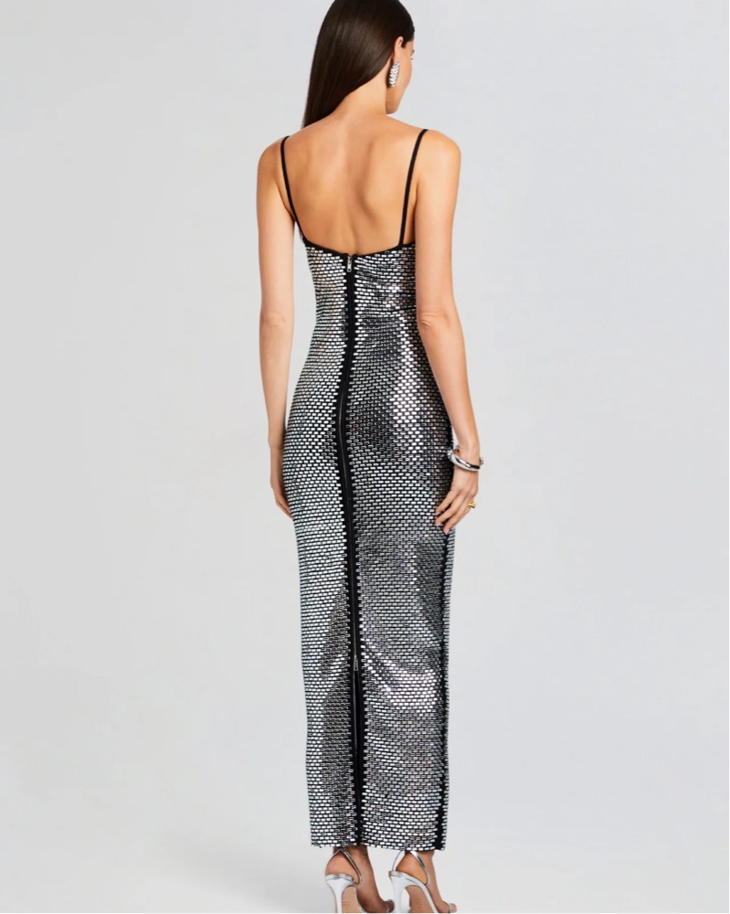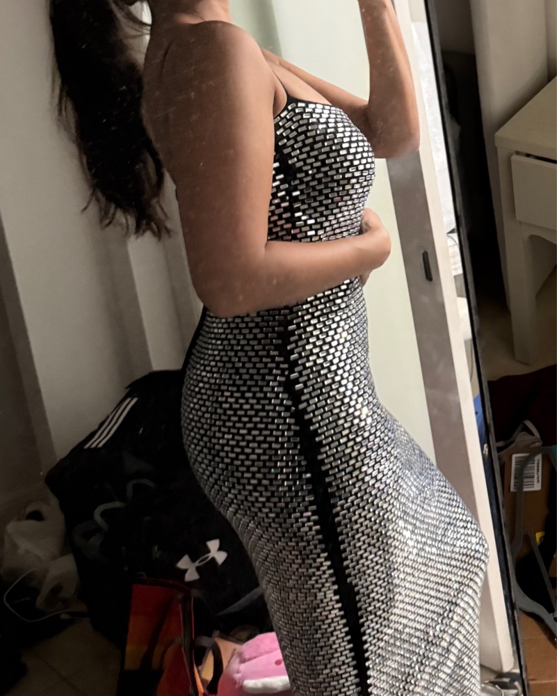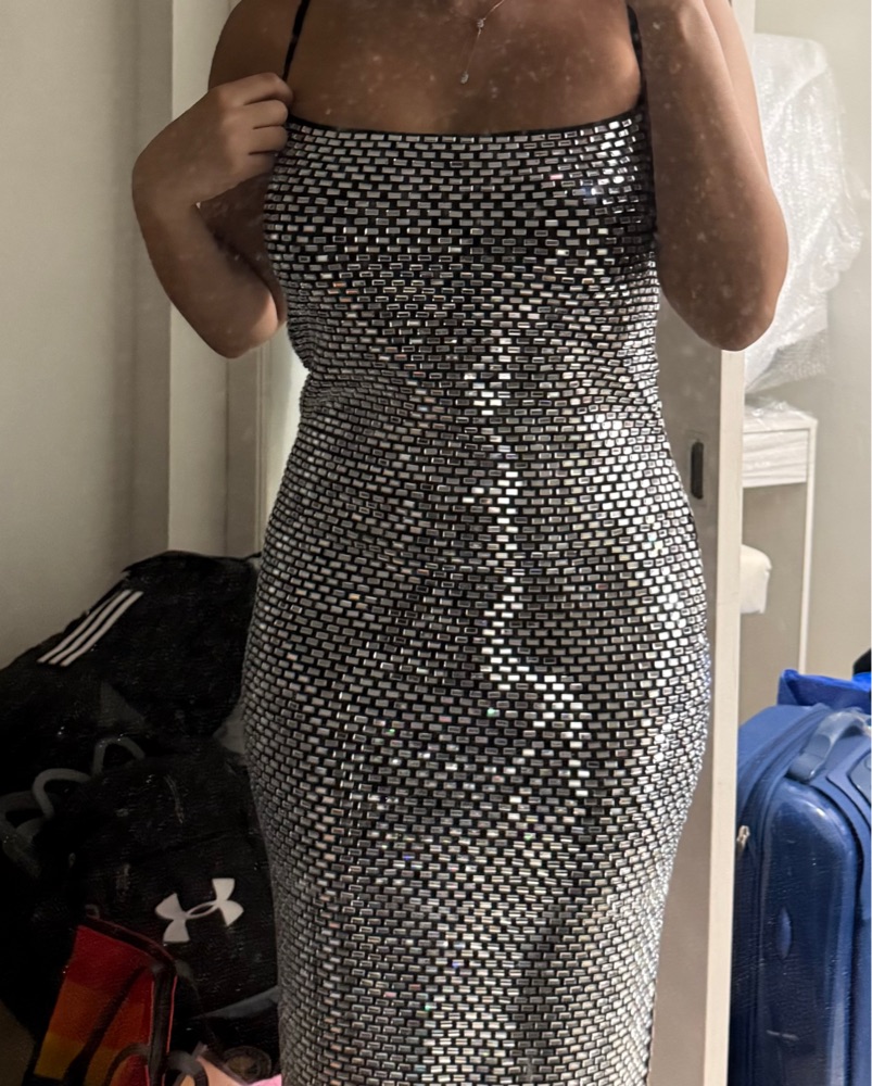 Heavyweight crystal embellished fabric. Seriously a dream dress. You will 1000% stand out. Warning it’s a bit heavy but you don’t even feel the weight. The shine is everything😍