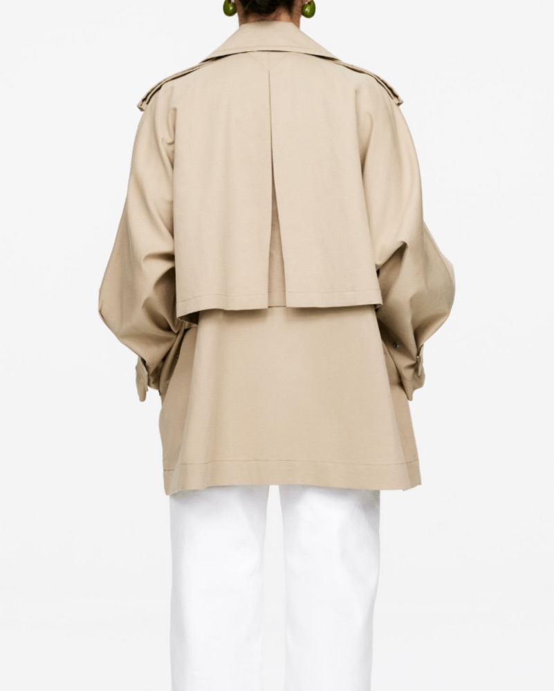 Beige short trench,new take on the iconic trench coat, this short version comes in a twill-woven blend of linen and cotton. The coat offers a voluminous silhouette with a hidden press-button closure and features classic details such as shoulder epaulettes, sleeve straps, a rain guard, and gun flap.