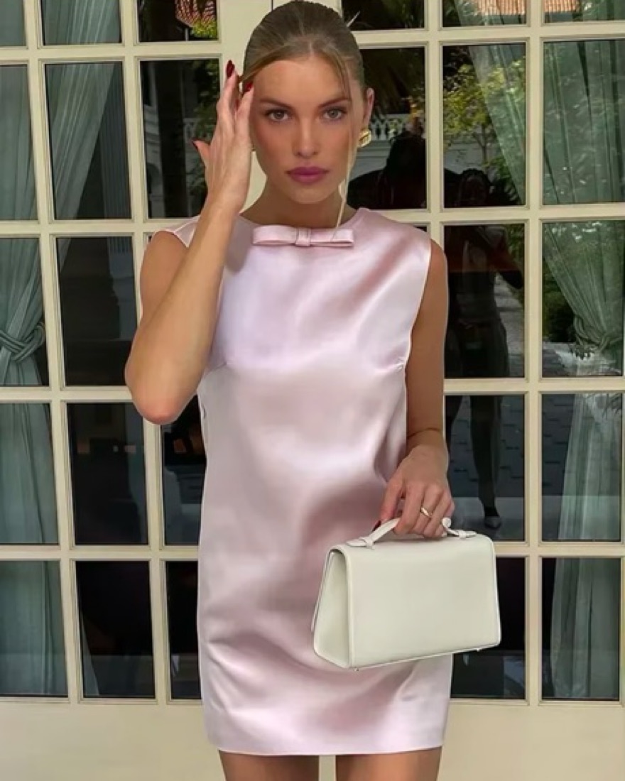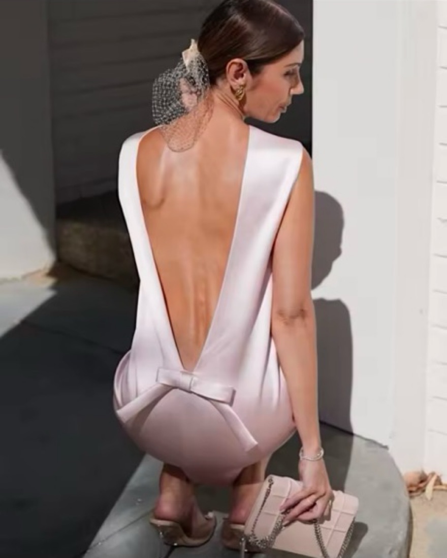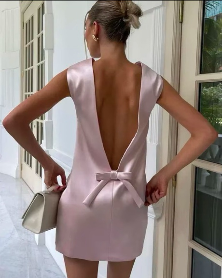 Elegant satin mini dress with a stunning open back and feminine bow detail. Brand new with tags attached :)