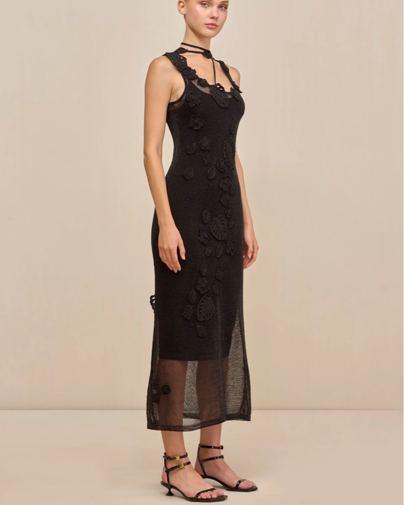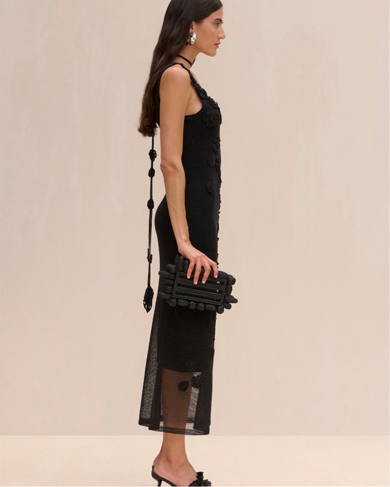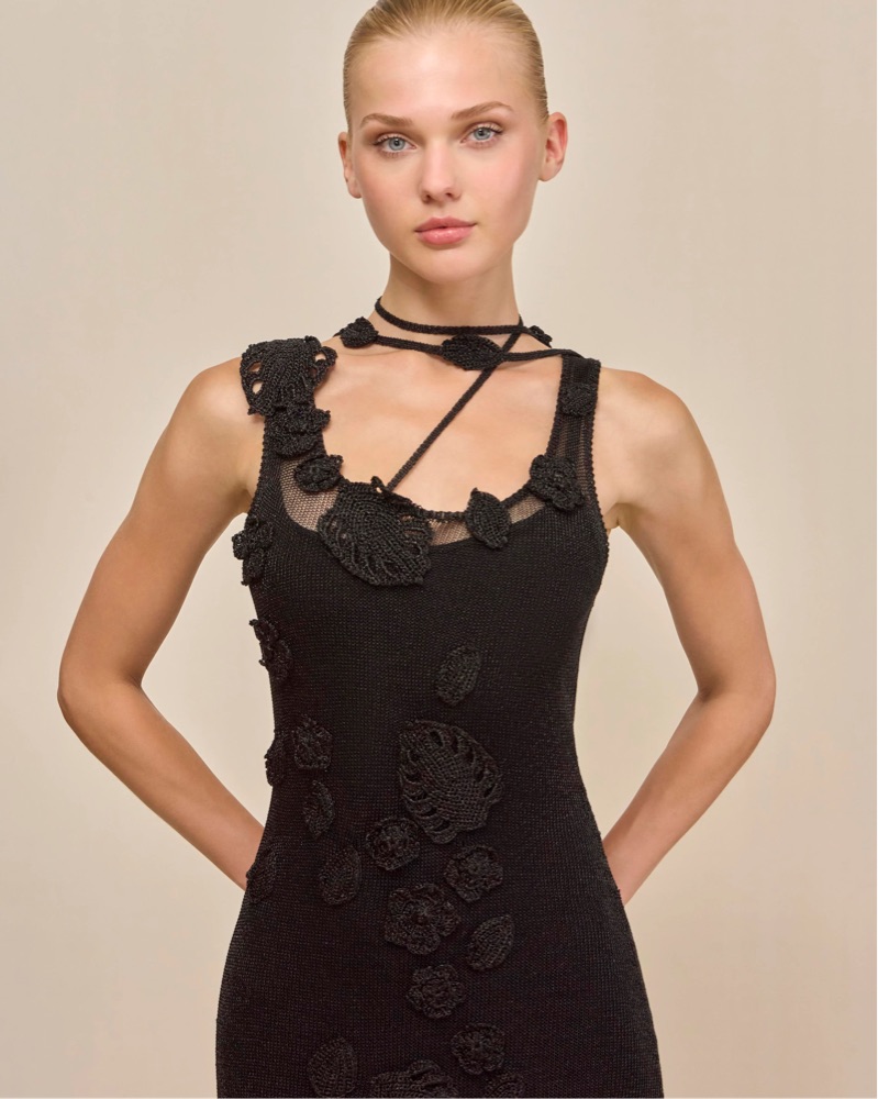 The Pemma Dress is a work of art. The Pemma is hand crocheted and the floral accents are applied by hand. Black yarn endows this dress with an exquisite air. Lengths of flowered cords lay across the neck. Comes with a removable slip.