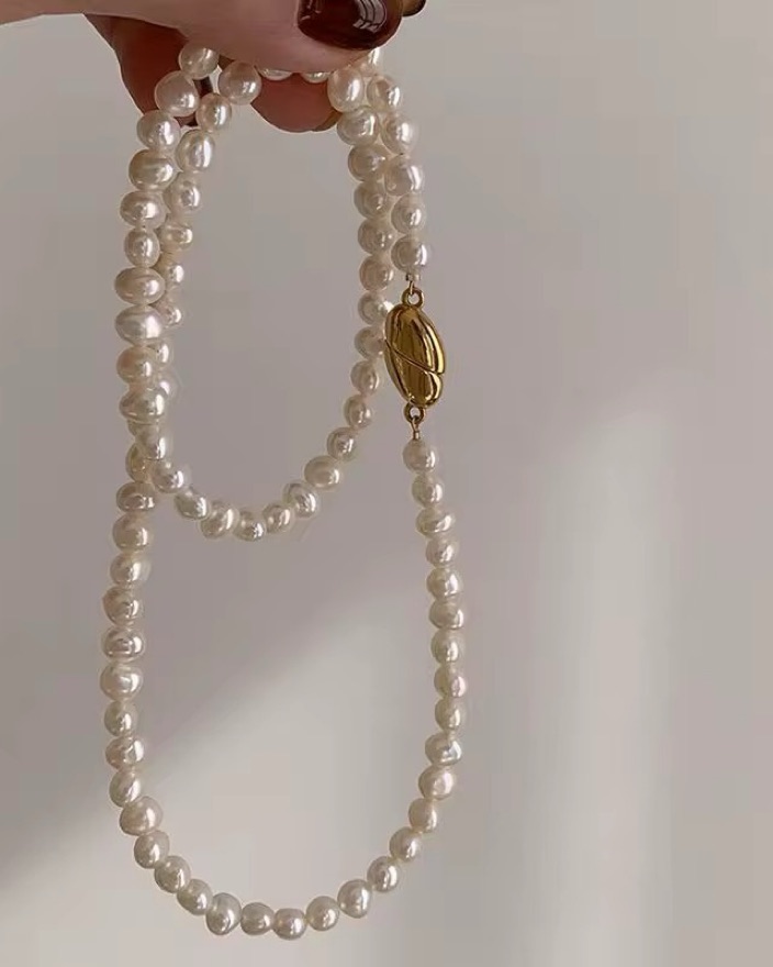 This beautiful pearl necklace adds a touch of sophistication to any outfit. Pair it with a little black dress for a chic evening look.
