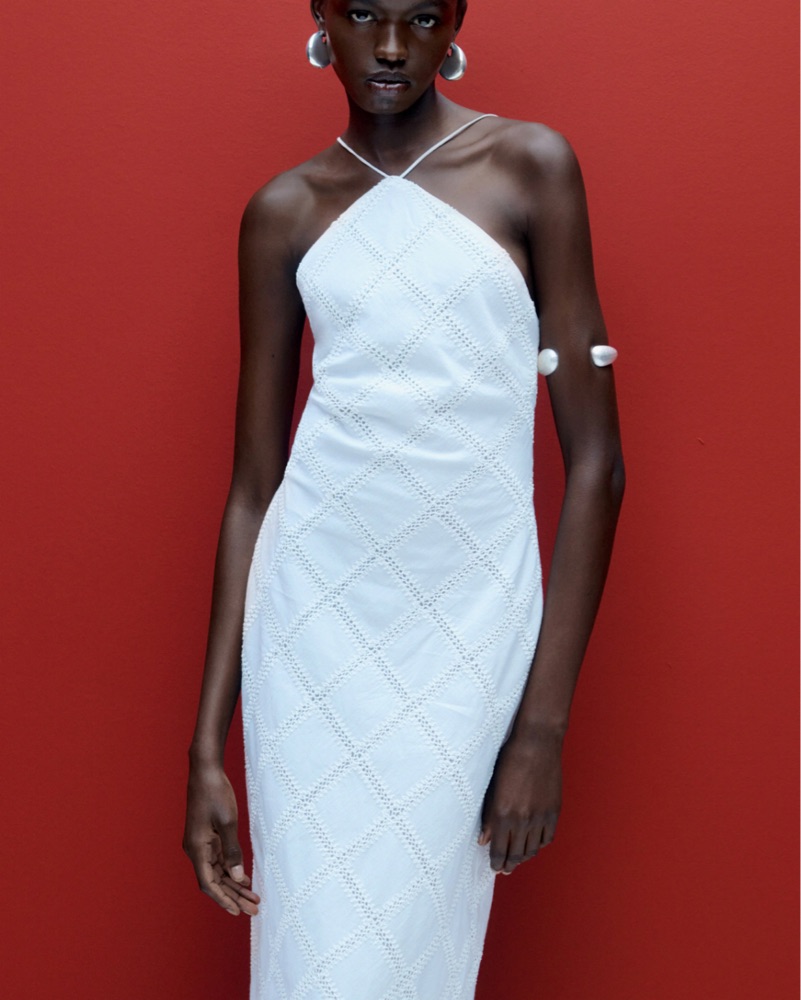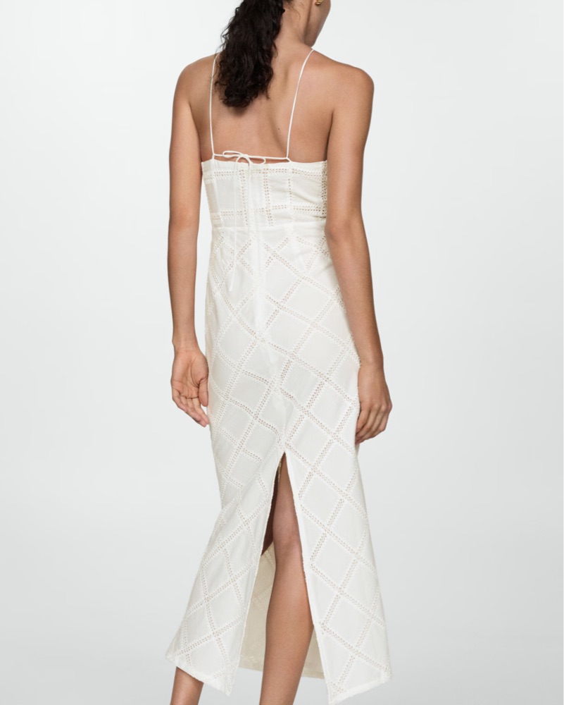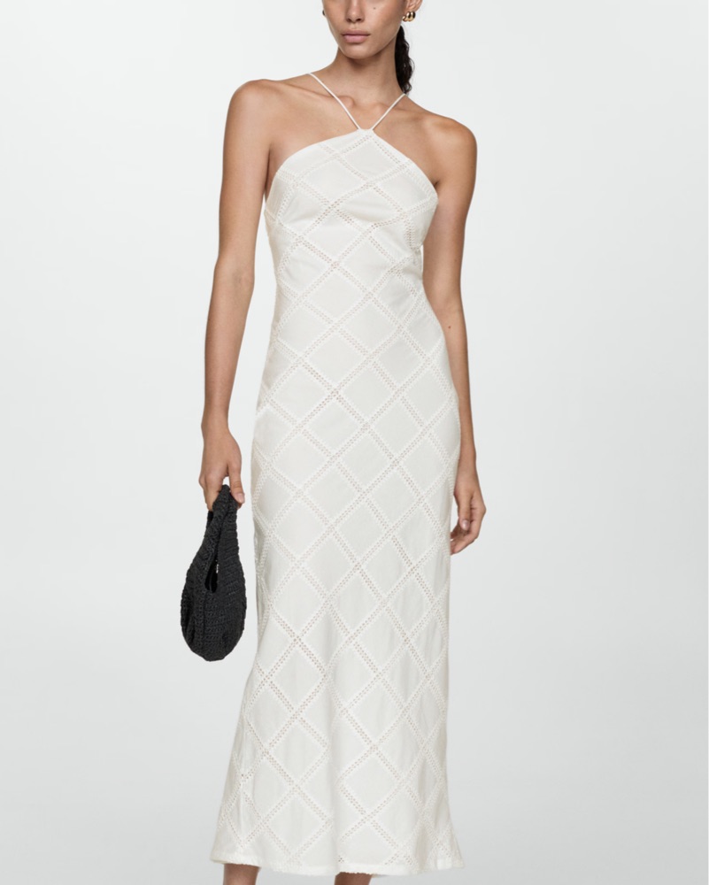 Mango Embroidered White Halter Dress with adjustable straps and back slit, size medium. Perfect for brides and bridal events!