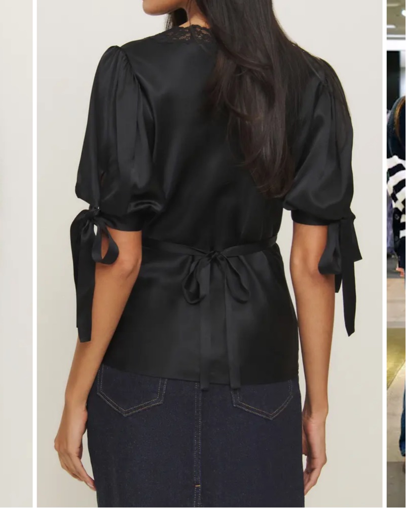 Perfect date night/going out top! Short puffed sleeve top with a v-neckline, ties at the arm, and lace detailing along the neck and bust. Super flattering with the adjustable back tie! 100% silk. Ref size 2.