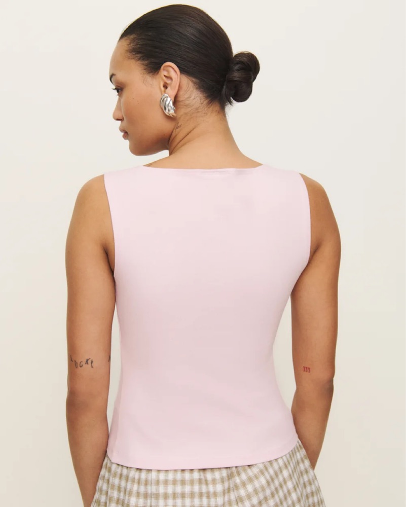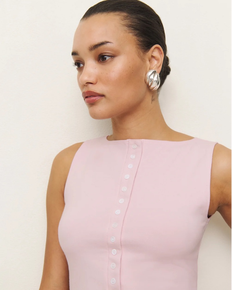 Contrasting buttons provide a polished finish for a stretch-cotton tank top that's a contemporary style staple.