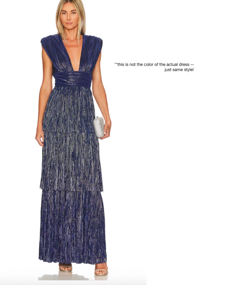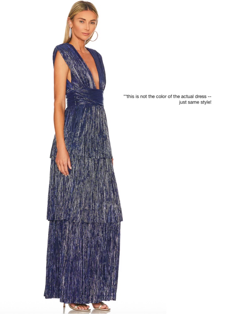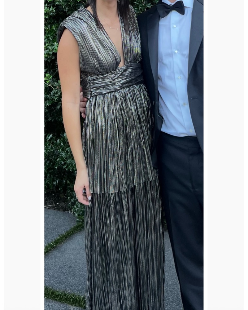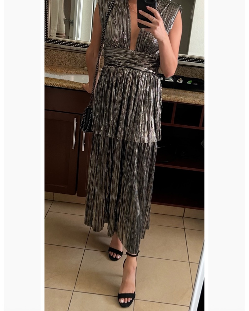 This stunning metallic pleated maxi dress is perfect for a glamorous evening event. The deep v-neckline and elegant silhouette create a stylish and confident look.