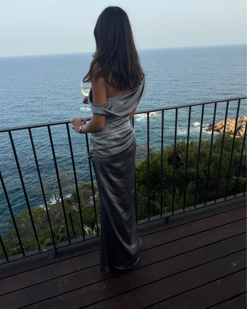 Blue silk Meshki dress, cinched waist, unique off the shoulder neckline, worn once and dry cleaned