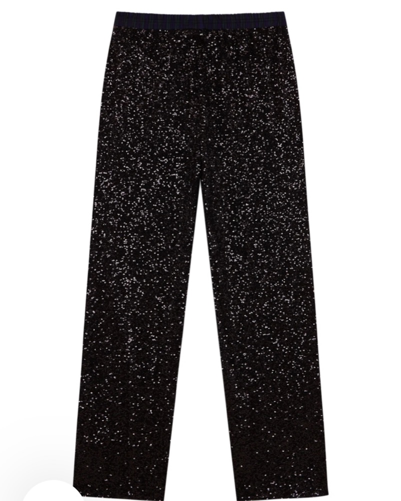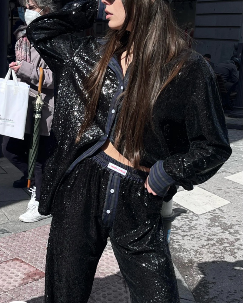 Hand over black sparkly pants