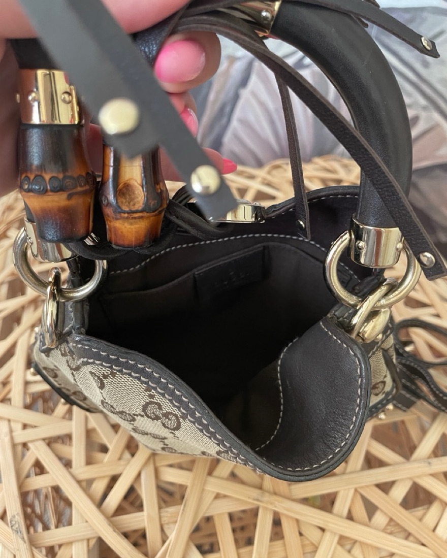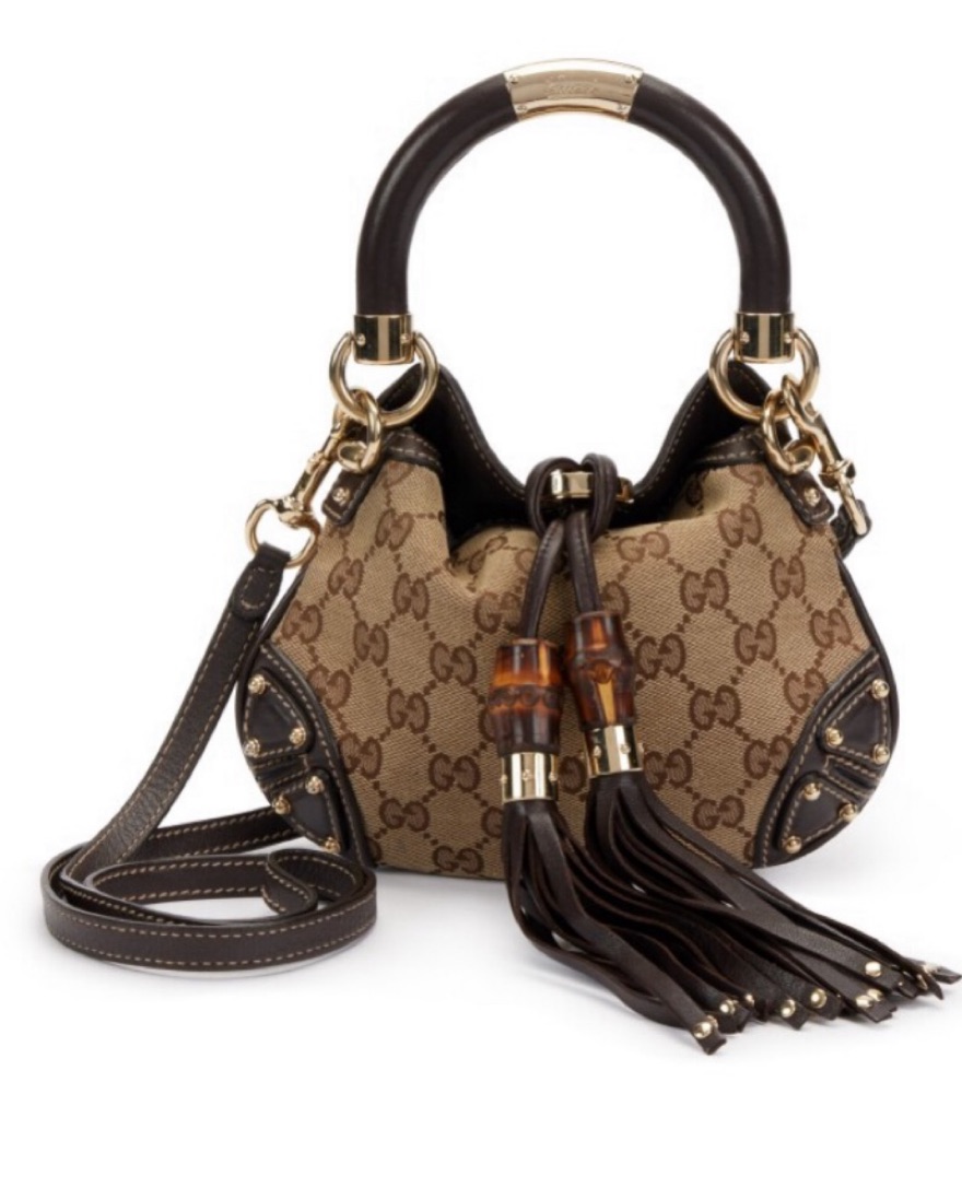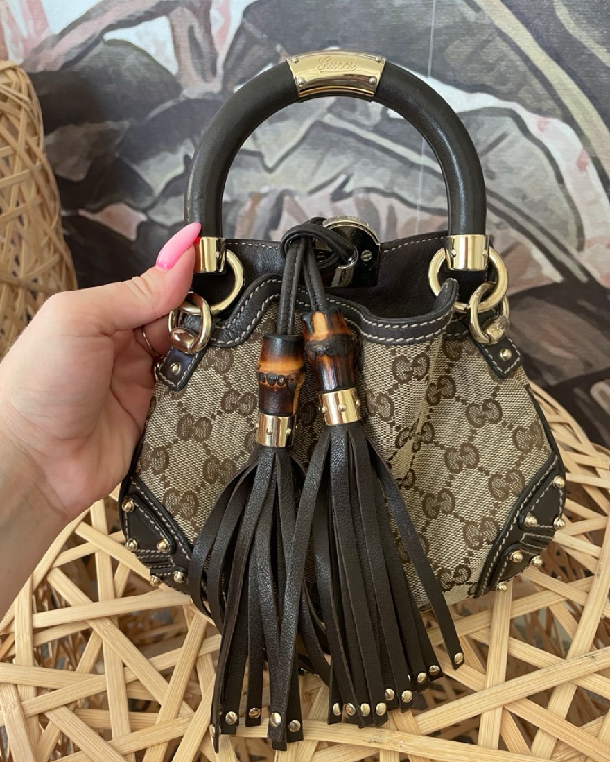 This bag is lined with brown fabric Includes tassels and shoulder strap