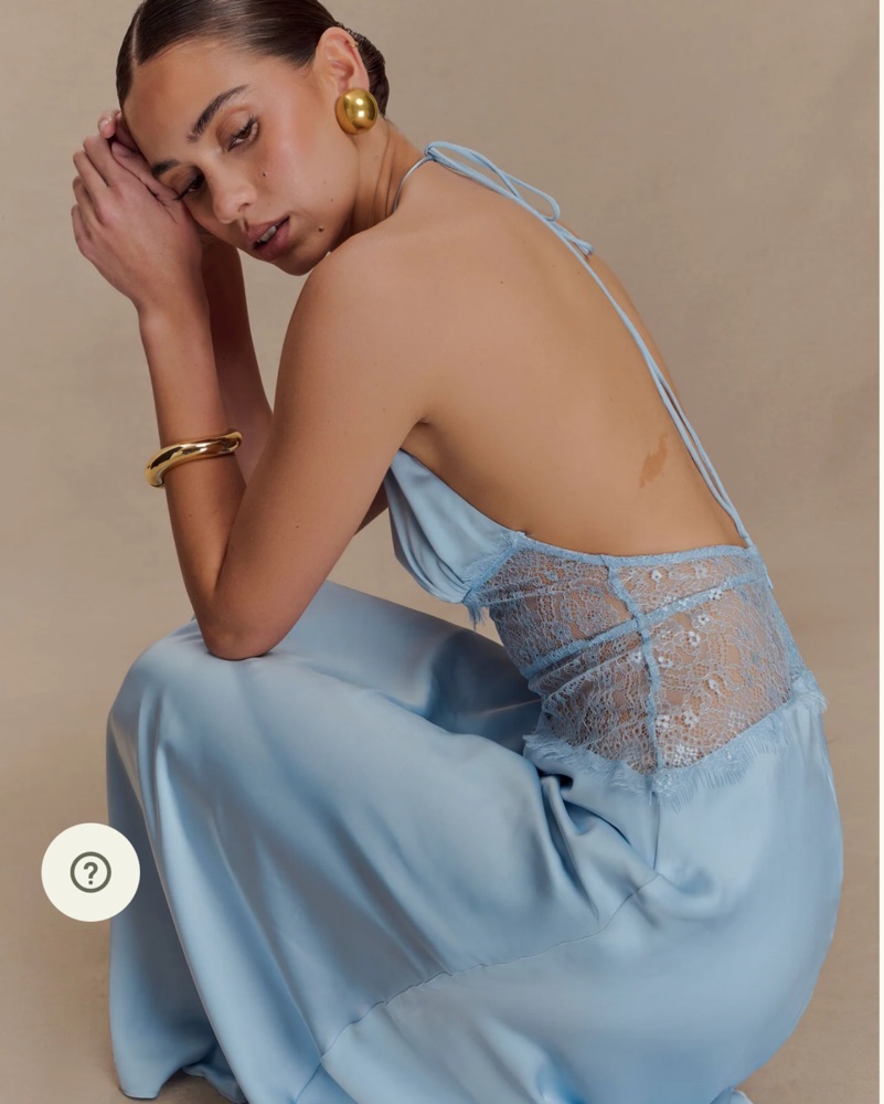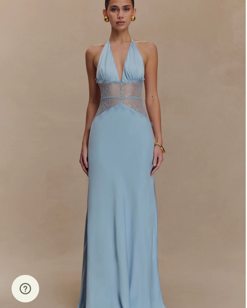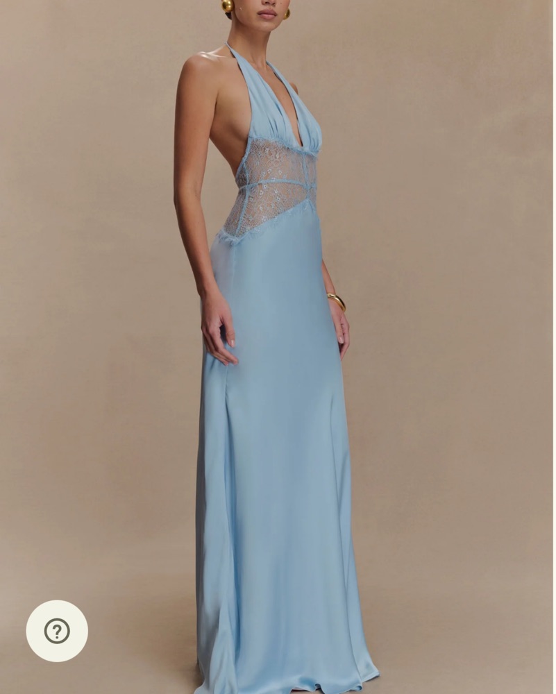 urn heads in the DINAH Lace and Satin Maxi Dress, a romantic silhouette that blends soft textures with sultry details. Featuring a halter tie V neckline and softly gathered bust, this dress flows into a sheer lace body that skims the figure with ease. The low back adds a touch of drama, petite style