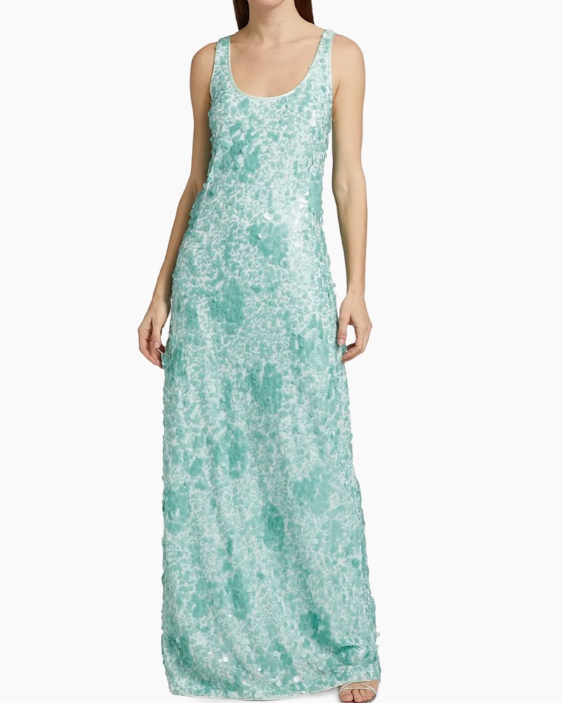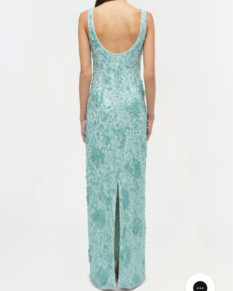 I had this hemmed (I’m 5’2) w/ 3inch heels to be floor length. Somewhat delicate due to the sequins. Stretch like material. Can fit size 0-2 for a shift style, or size 4 for more form fitting. Dry cleaning included in price. *Partial fit refunds only for this dress*