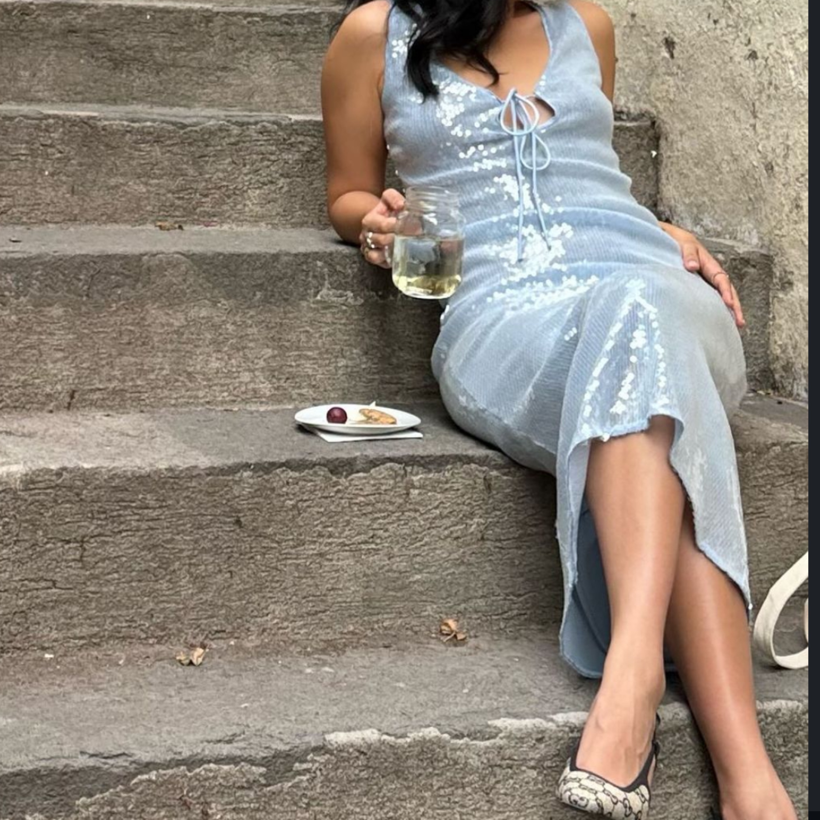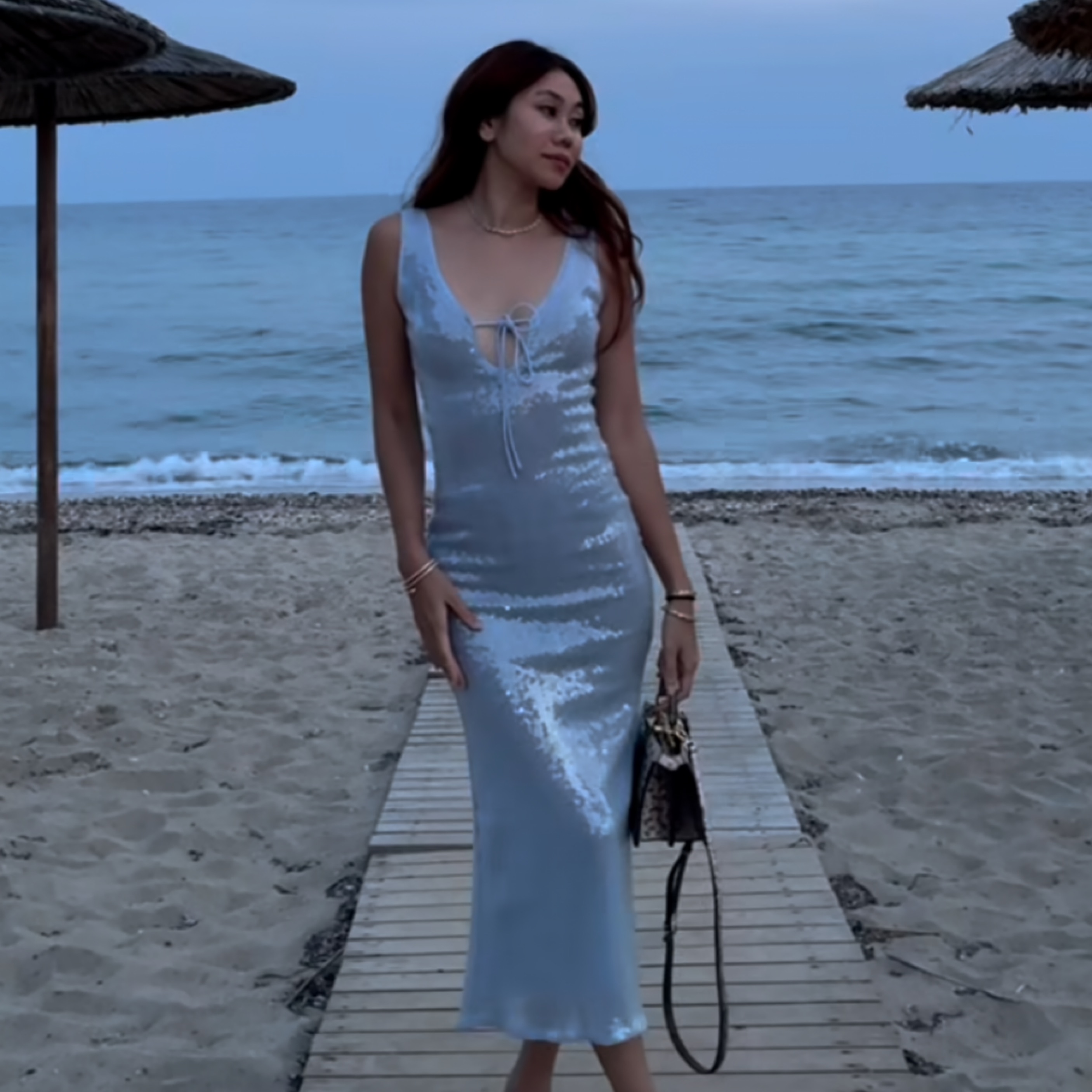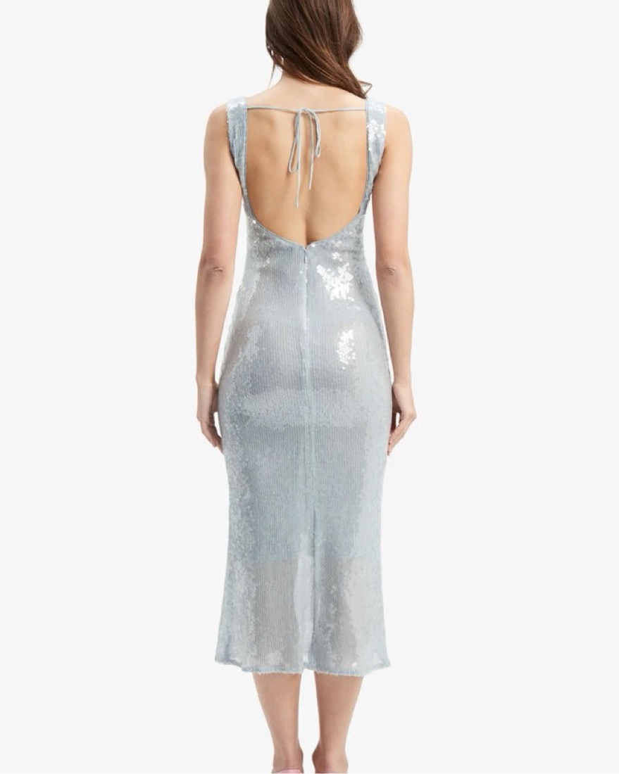 Bardot light blue sequin midi dress, from Revolve