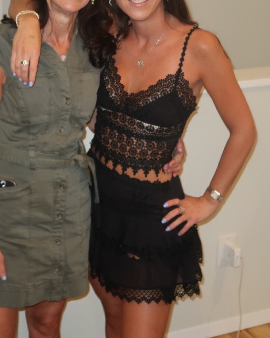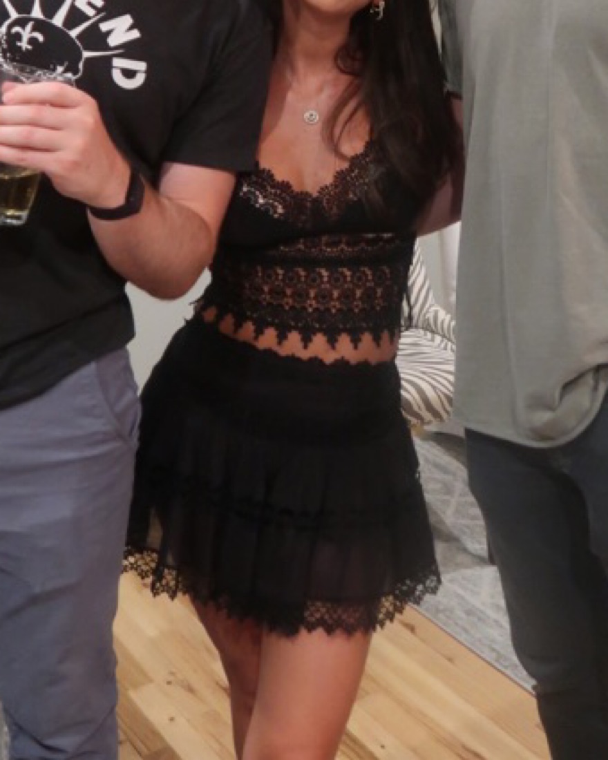Perfect with a simple bodysuit or bathing suit, or matching top (also available). Crochet lace detailing mini skirt with black slip under. Not see through. Excellent condition. Worn 1-2x