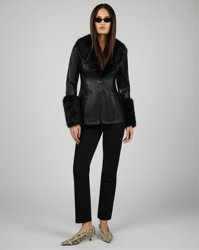 Faux fur details the cuffs and v-neck collar of this vegan leather jacket. It has padded shoulders, a cinched waist that gives way to a loose hem, and a three-button closure.