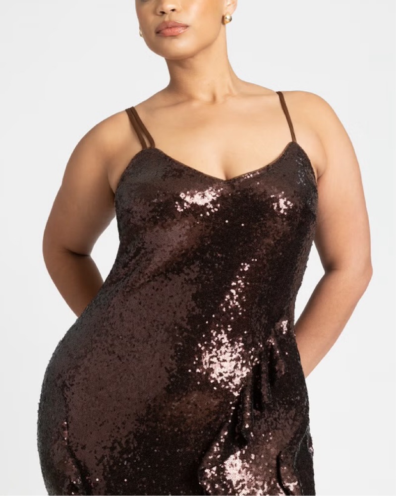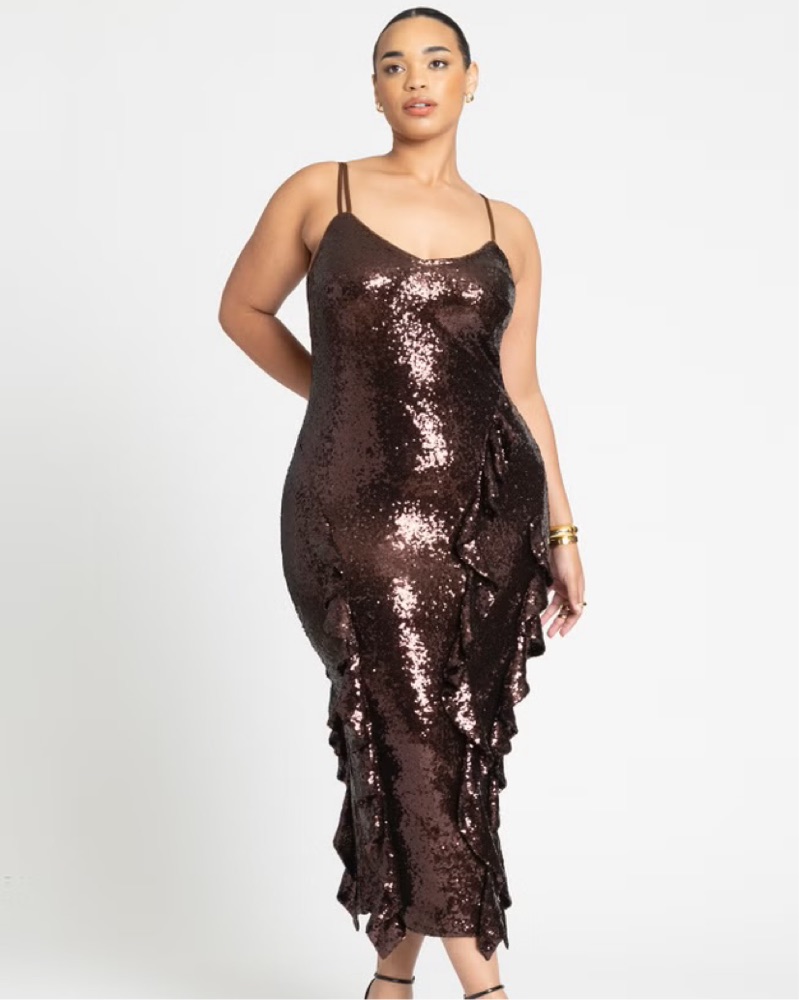Eloquii brown embellished sequin dress that has the perfect sparkle paired with various ruffle designs along the bottom half. Perfect for a wedding or special event! Size 20 dress