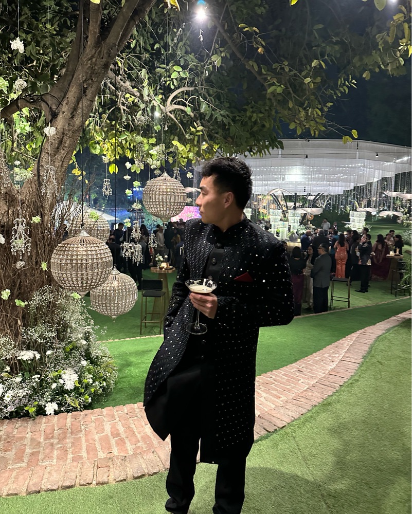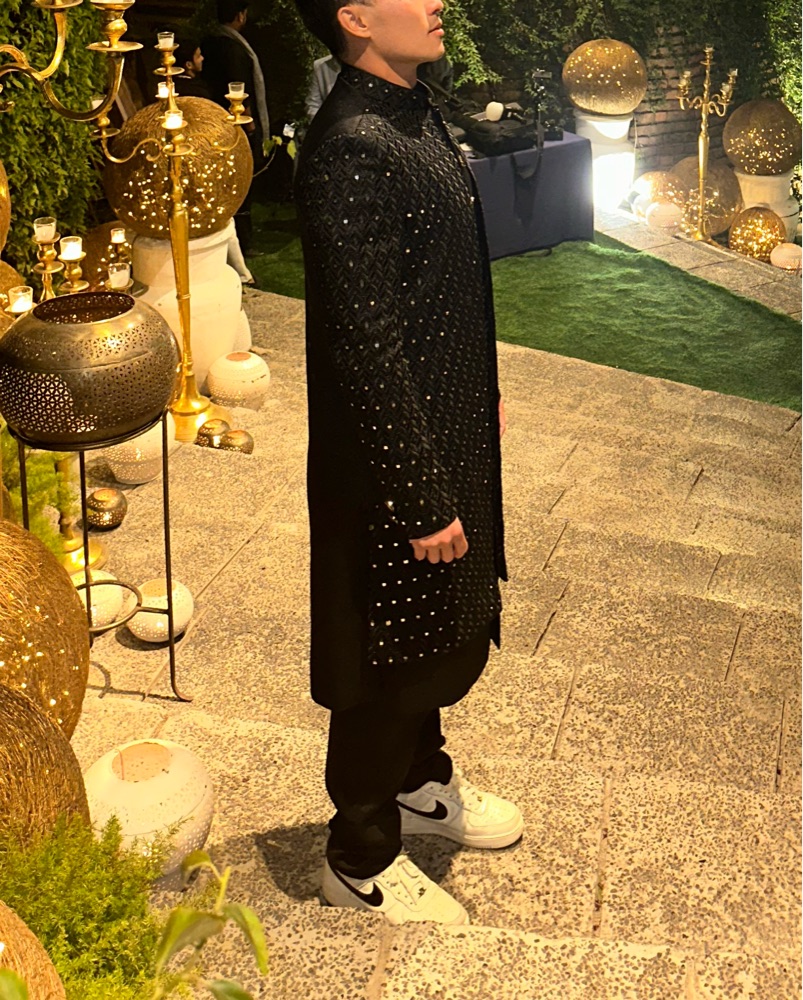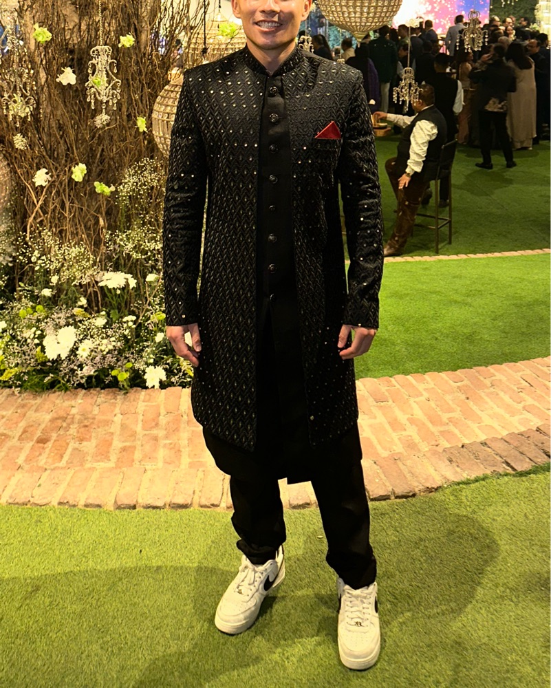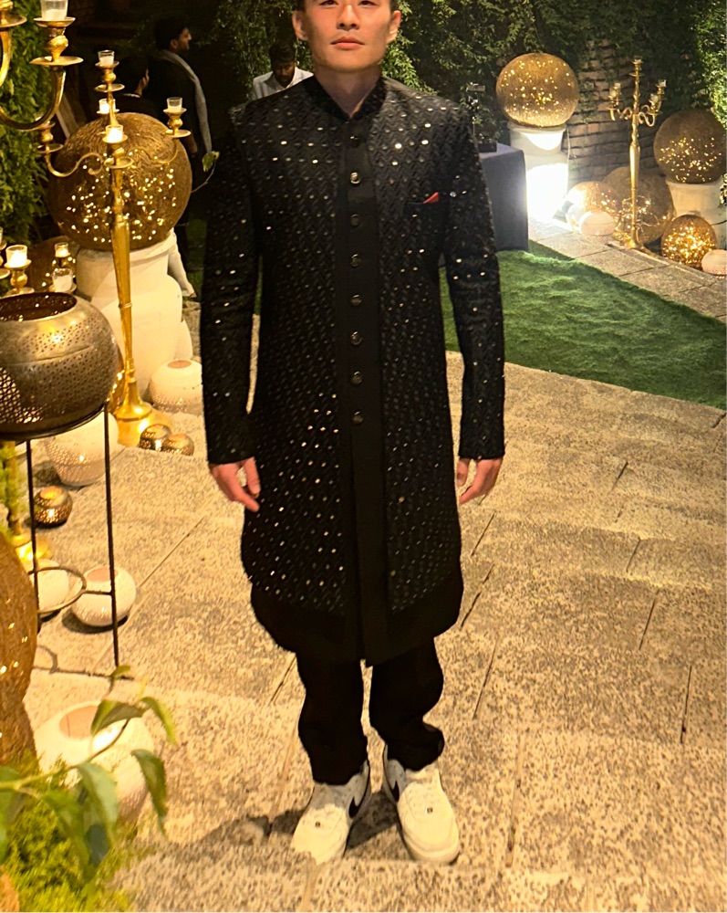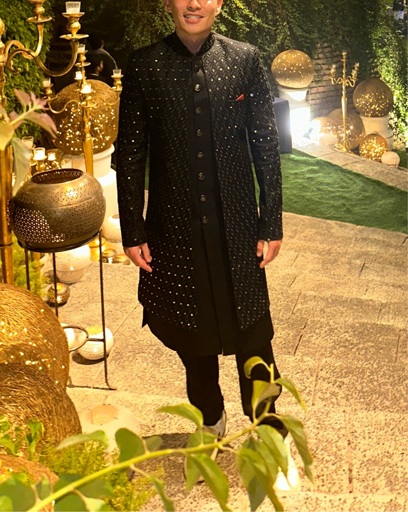 Kalki Mens size 38 black sherwani with silver mirror embellishments & red pocket napkin. Pictured on 5’8”, 32 waist, XL shirt top normally. Was slightly tight on his shoulders.