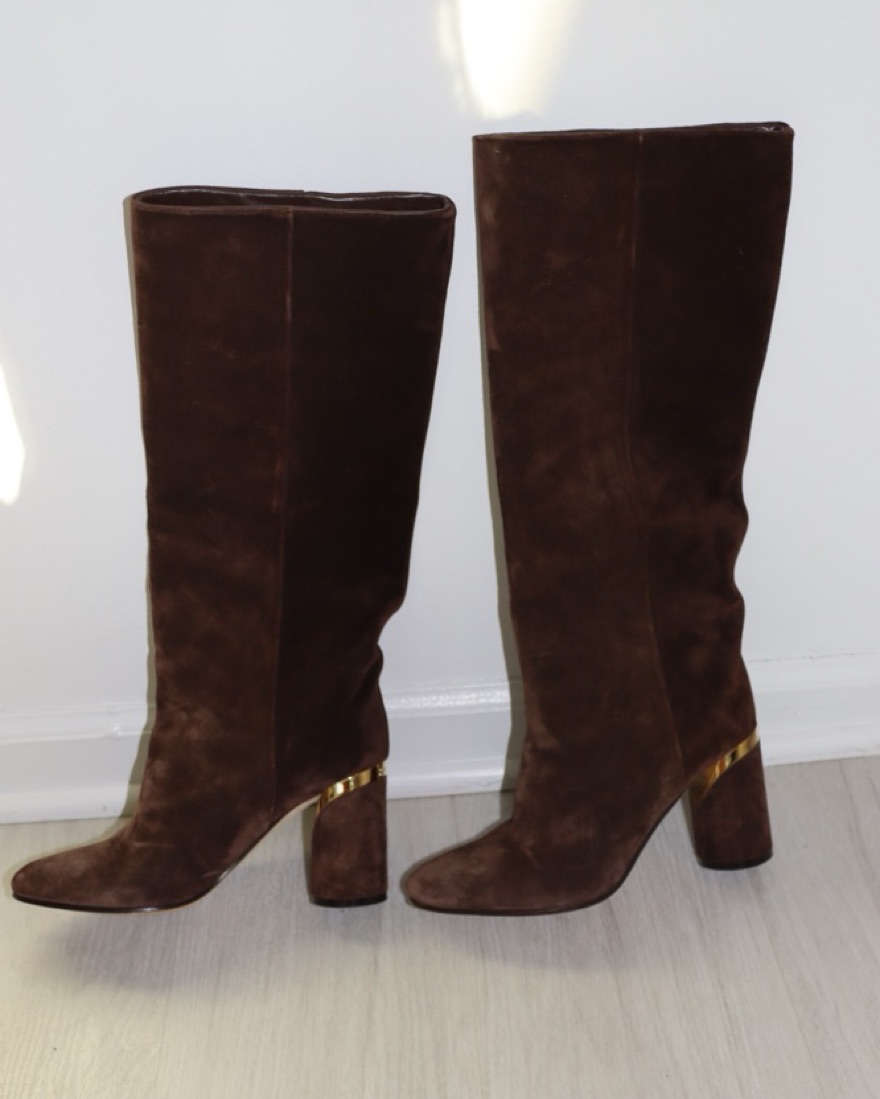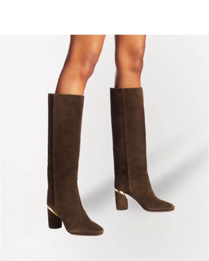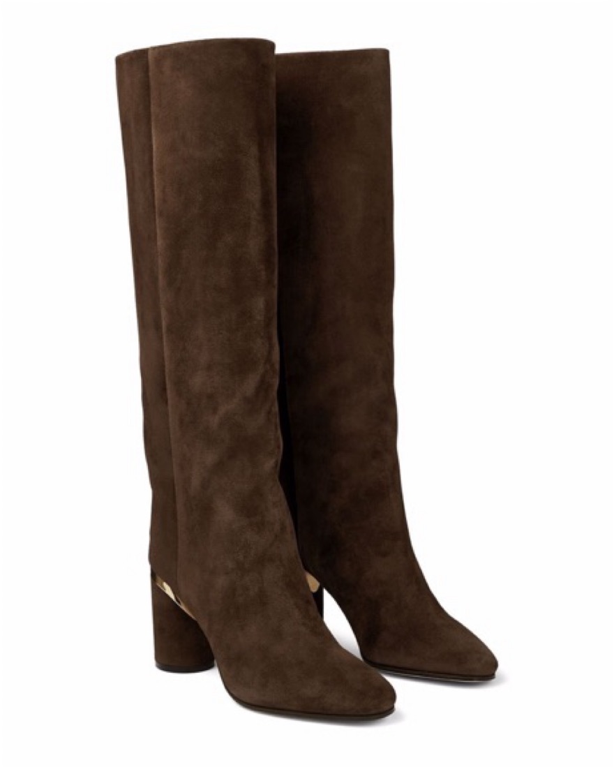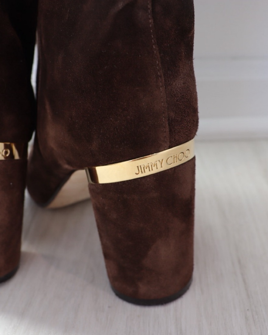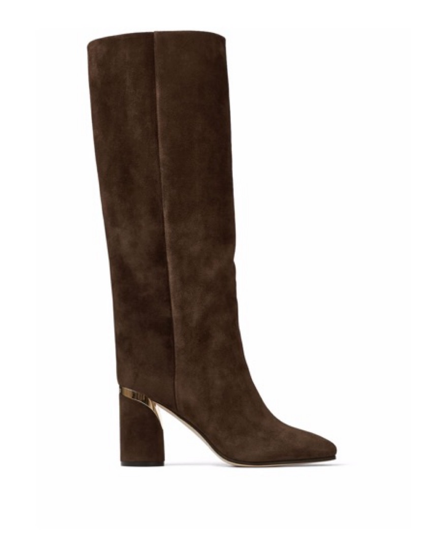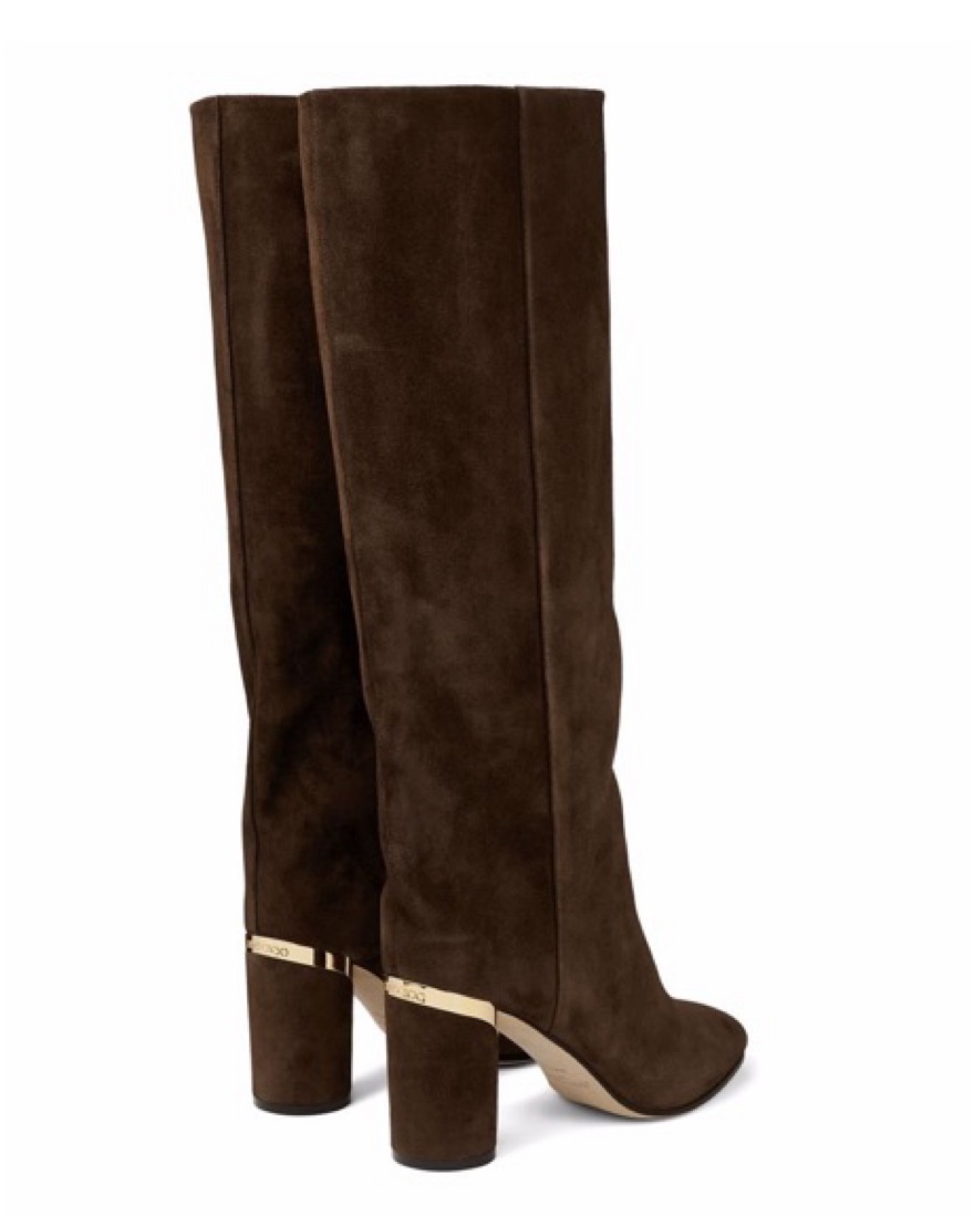Chocolate brown calf leather/suede Jayla 85mm knee-high boots from JIMMY CHOO featuring almond toe, gold-tone hardware, slip-on style, knee-length and high block heel.