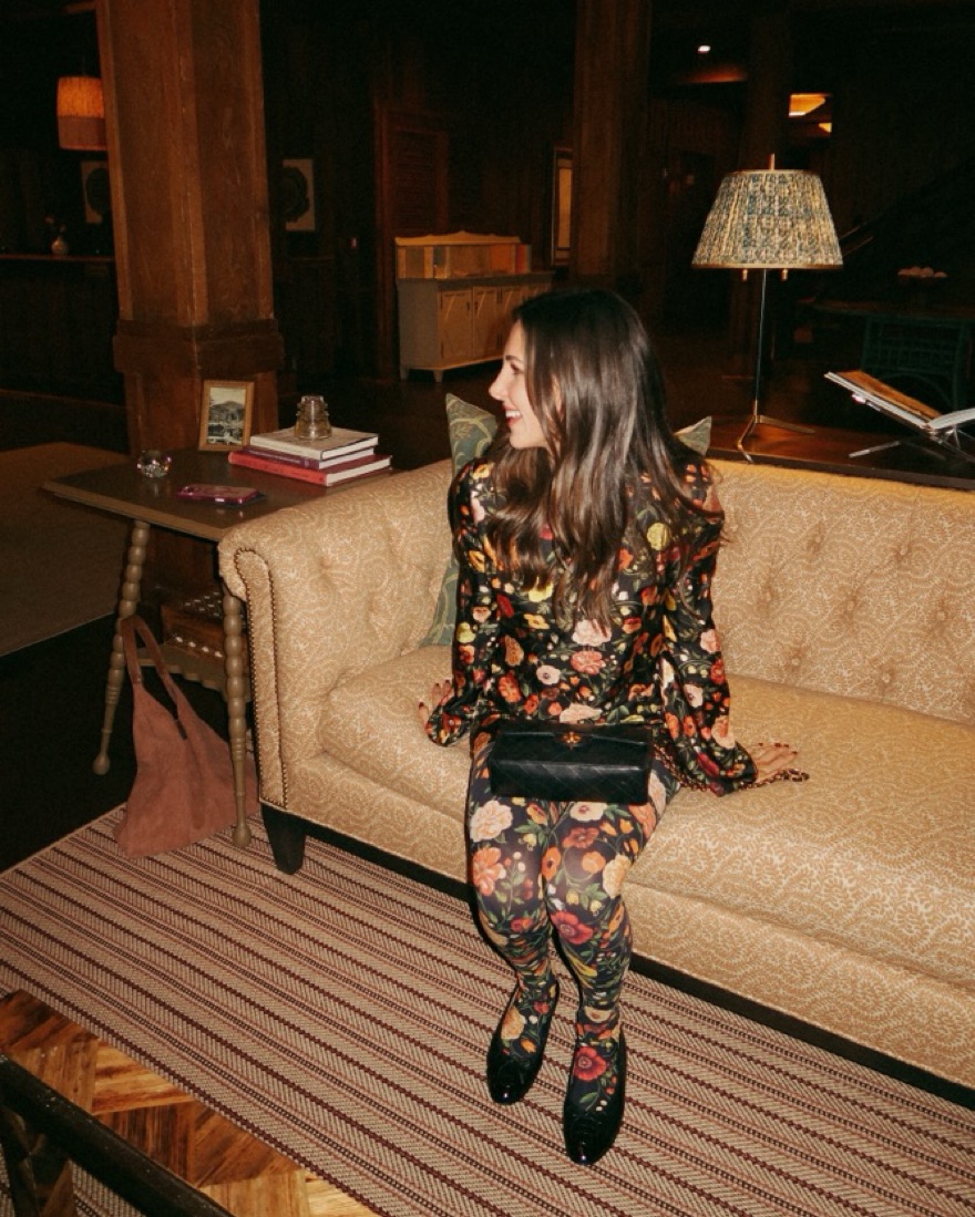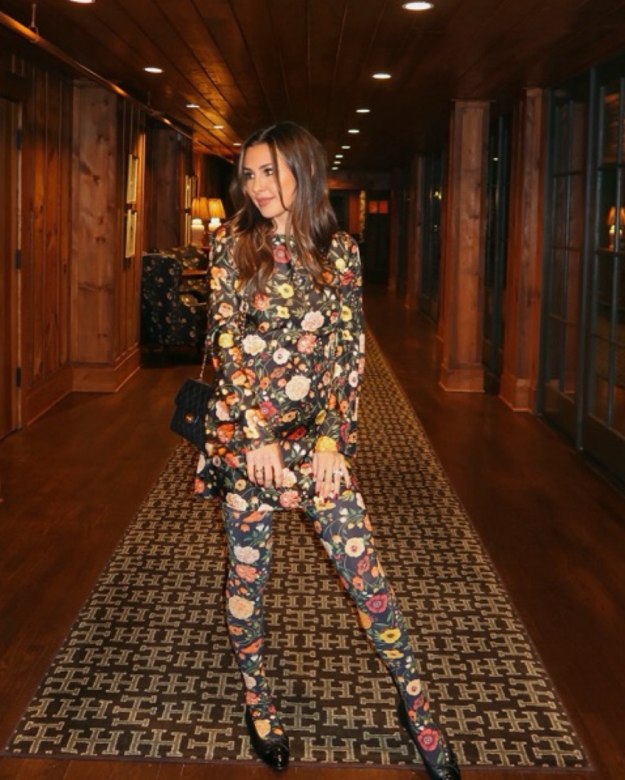 This stunning floral dress is perfect for a night out or special occasion. The bold floral print and bell sleeves create a chic, eye-catching look. Comes with matching tights in small.