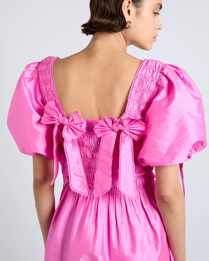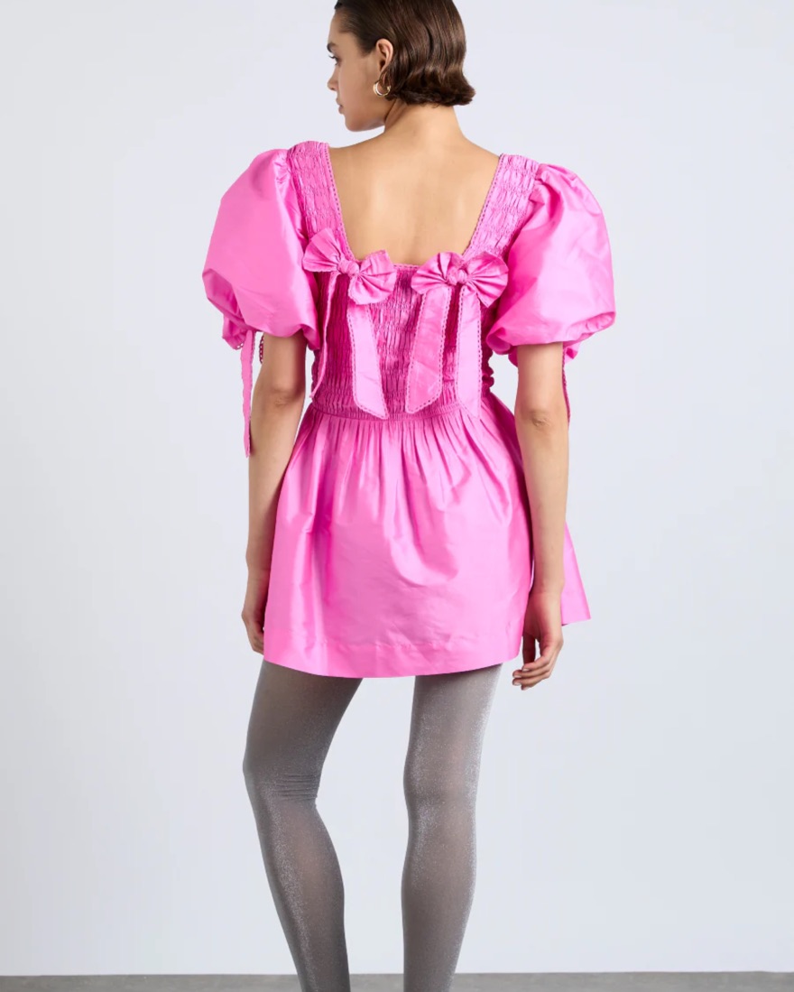 pink Lauren mini dress features short puff sleeves, a shirred bust and feminine bow details. •Shirred bodice •Short puff sleeves •Back bow detail