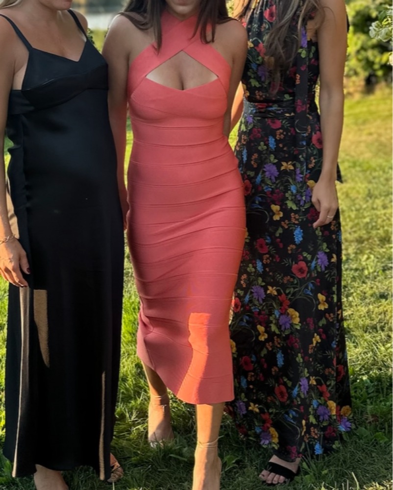 This vibrant midi dress is perfect for a night out or special occasion. The bandage detailing and cutout design create a flattering, eye-catching look.