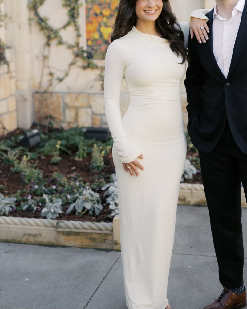 In perfect condition, wore for engagement pictures. Stretchy material and scrunches. I am 5’4 and it was a little long but since is scrunches around the waist that helped along with heels!
