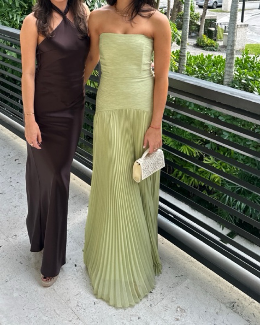 Dress is stunning! Color is everything. I got sooo many compliments. Really flattering and chic. Dress is very long, i wore 5inch platform heels. Top was a tad loose on me bc i tend to wear 0-2 (xs) tops and 4 in bottoms. But was still totally fine to wear. Dont need a bra as ita fully lined / with corset style bodice.