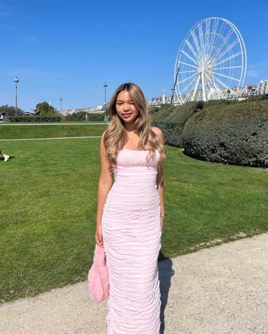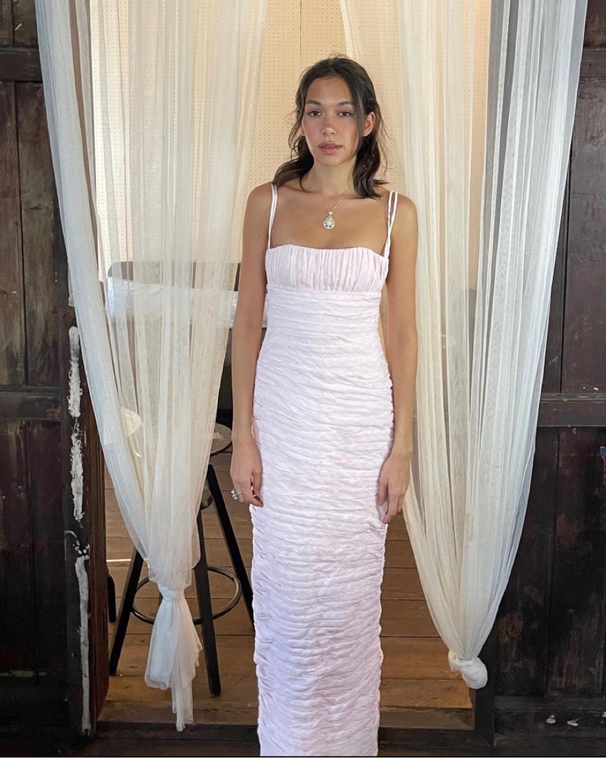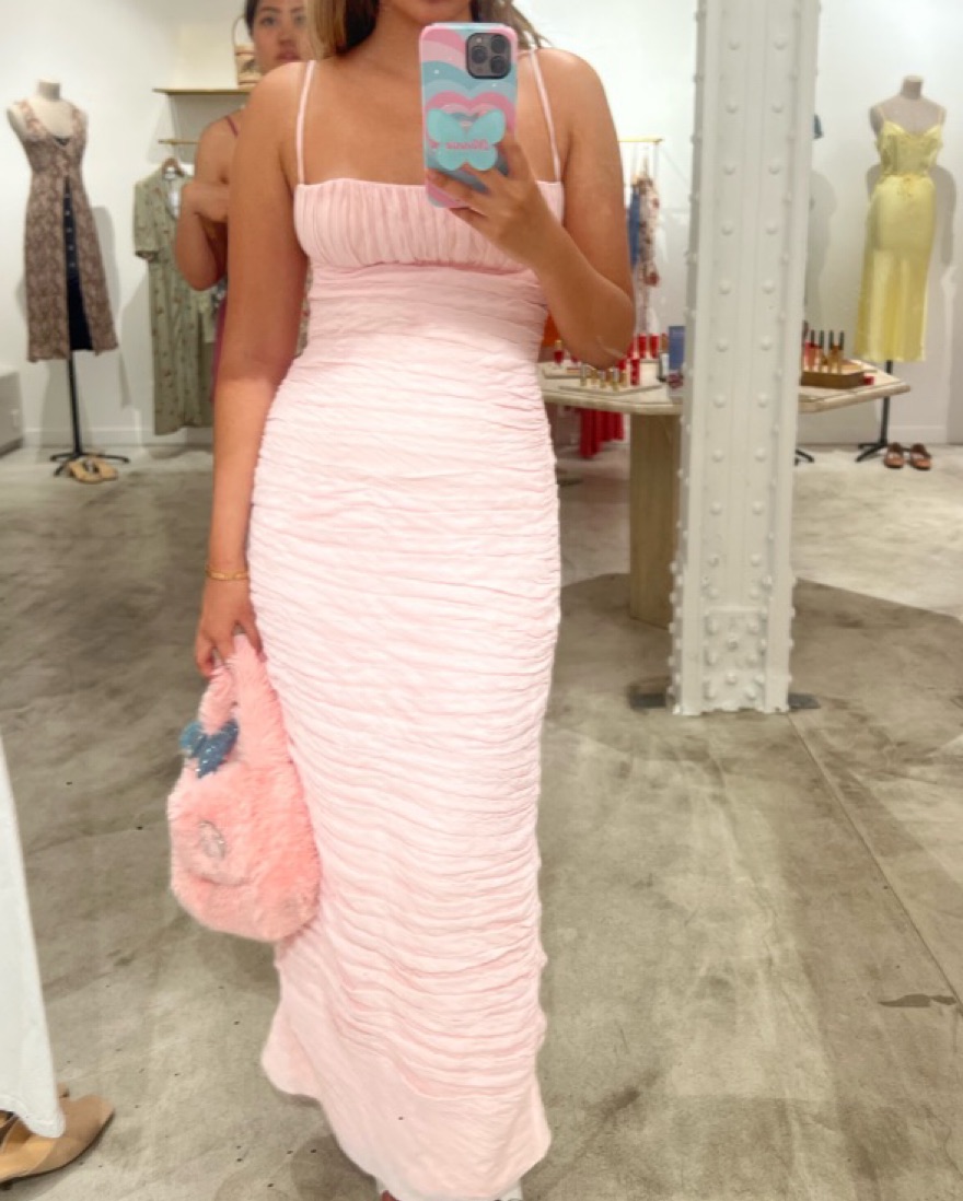 Hand-draped maxi dress- baby pink// my height is 5’4