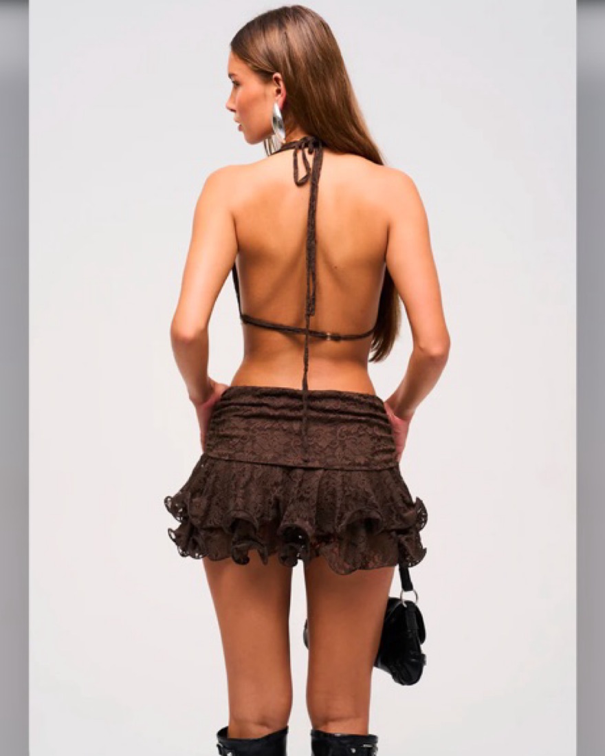 Fully lined • Lace outer fabric • Back strap with adjuster • Wrap overlay on skirt • Chrome buckle detail at centre-front • Layered ruffle skirt with wired hem details • Side seam invisible zip fastening • Mid stretch.