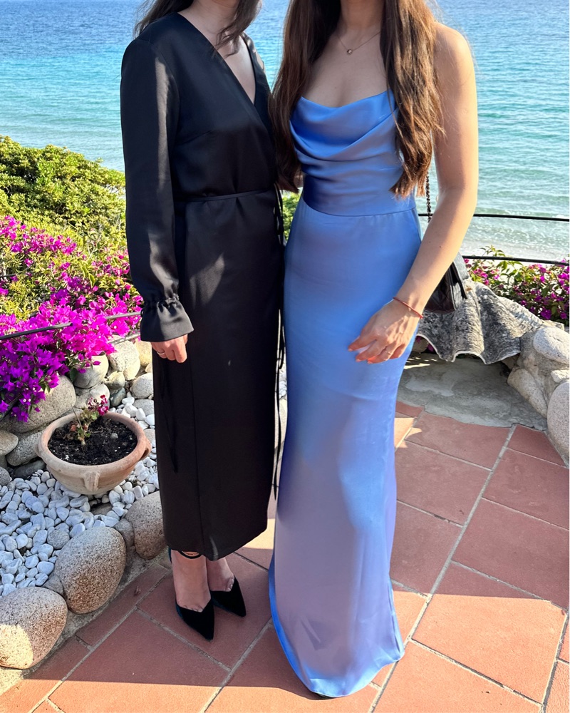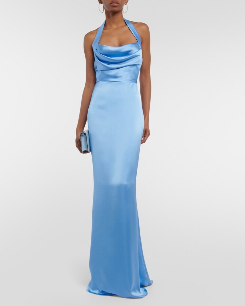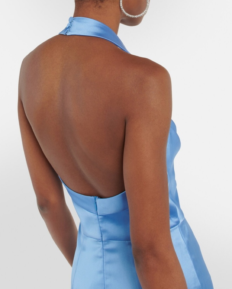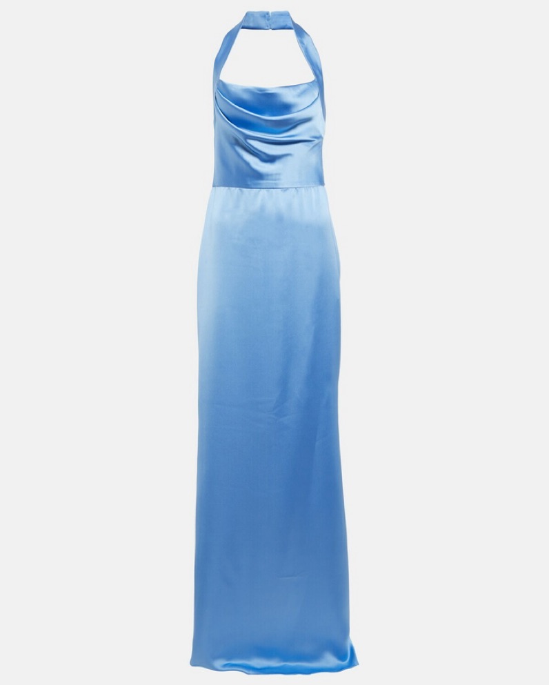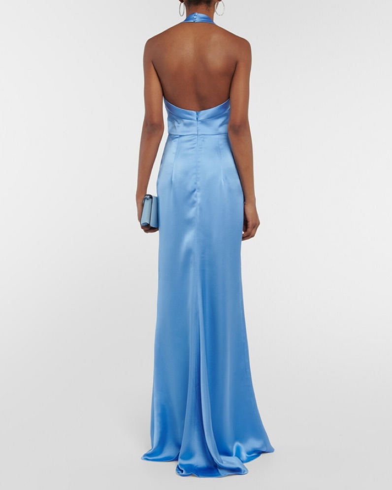 This stunning satin gown is perfect for a formal event or red carpet occasion. The halter neckline and flowing silhouette create a glamorous look.