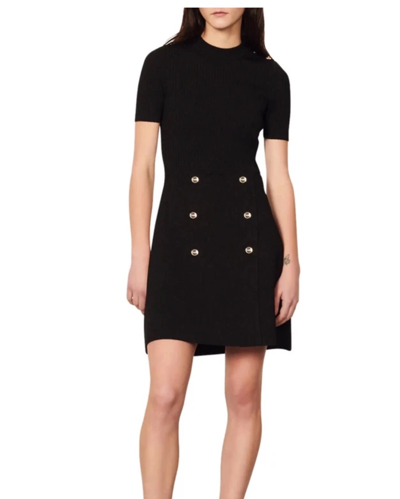Sleek black knit dress with short sleeves, a ribbed bodice, and gold button details. Effortless day-to-night style with a modern, polished edge.