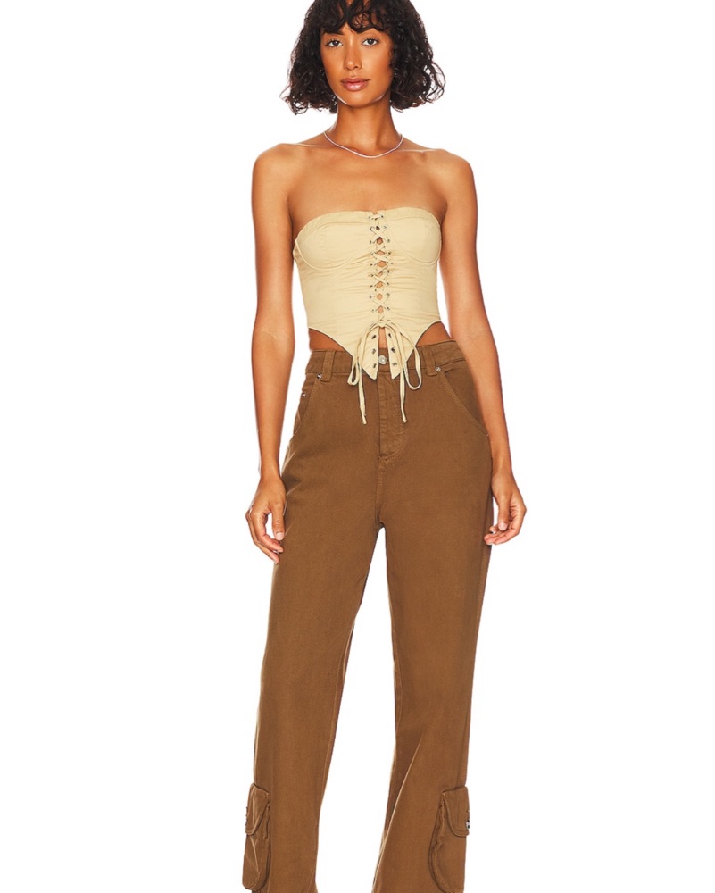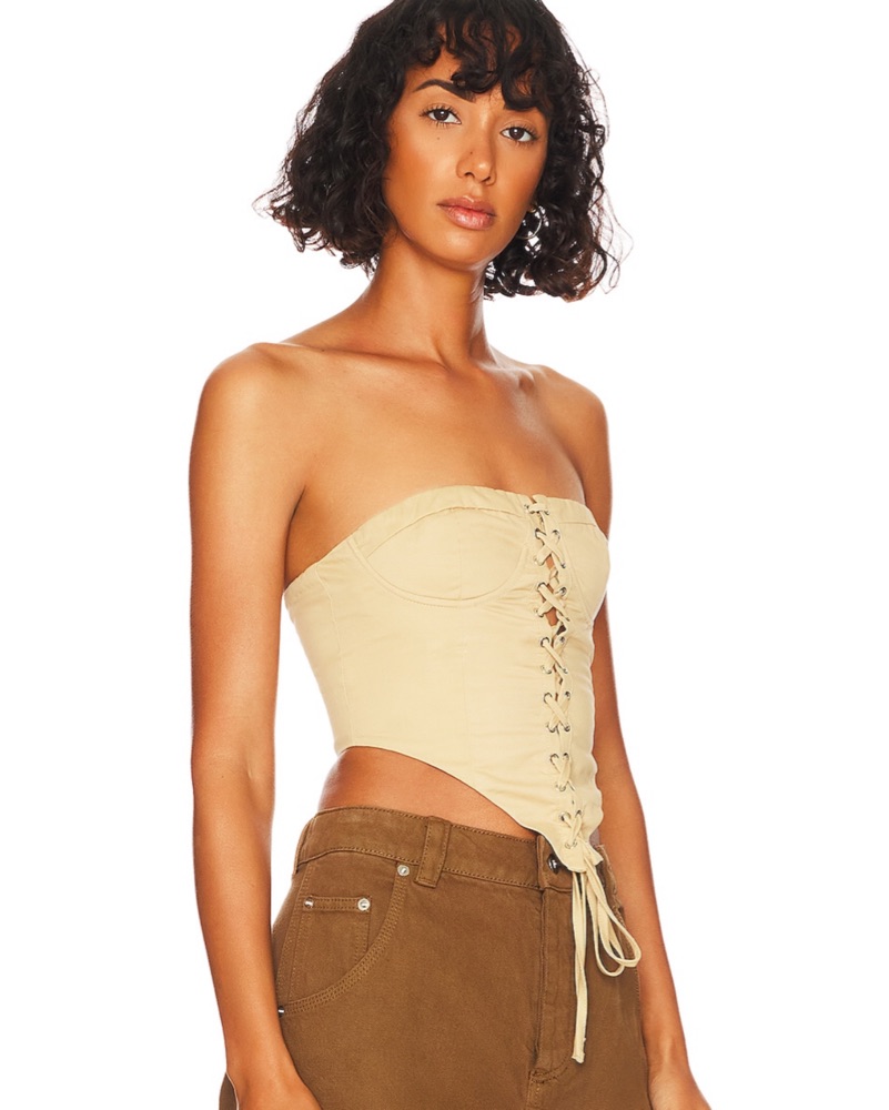Ashlyn Lace Up Strapless Top In Beige by Superdown - Pickle