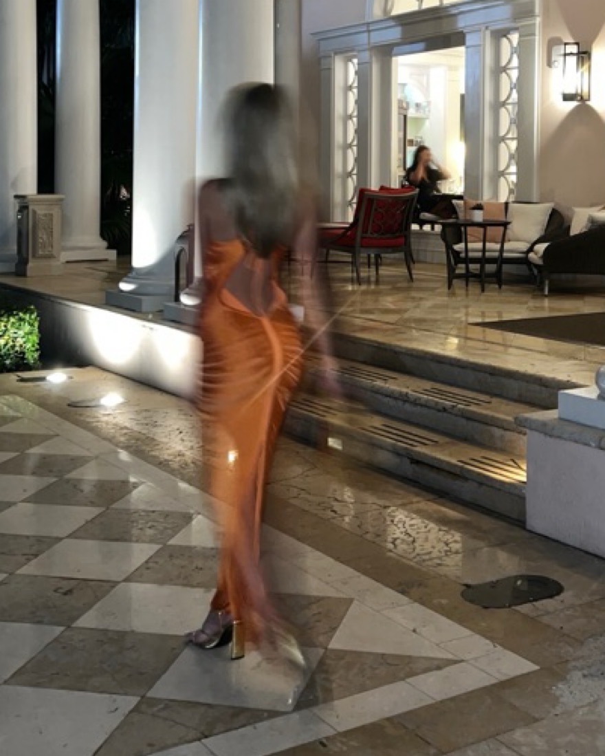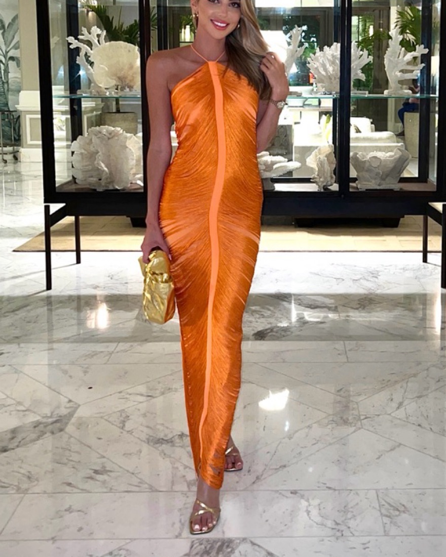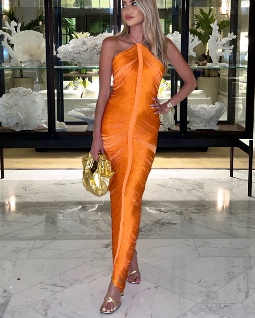 This stunning halter dress is perfect for a glamorous evening event. The vibrant orange hue and draped silhouette create an elegant and sophisticated look.