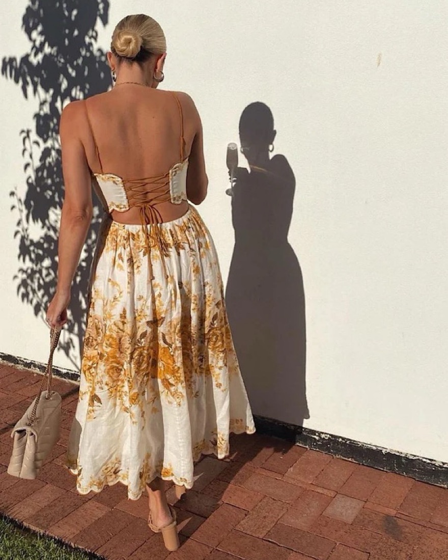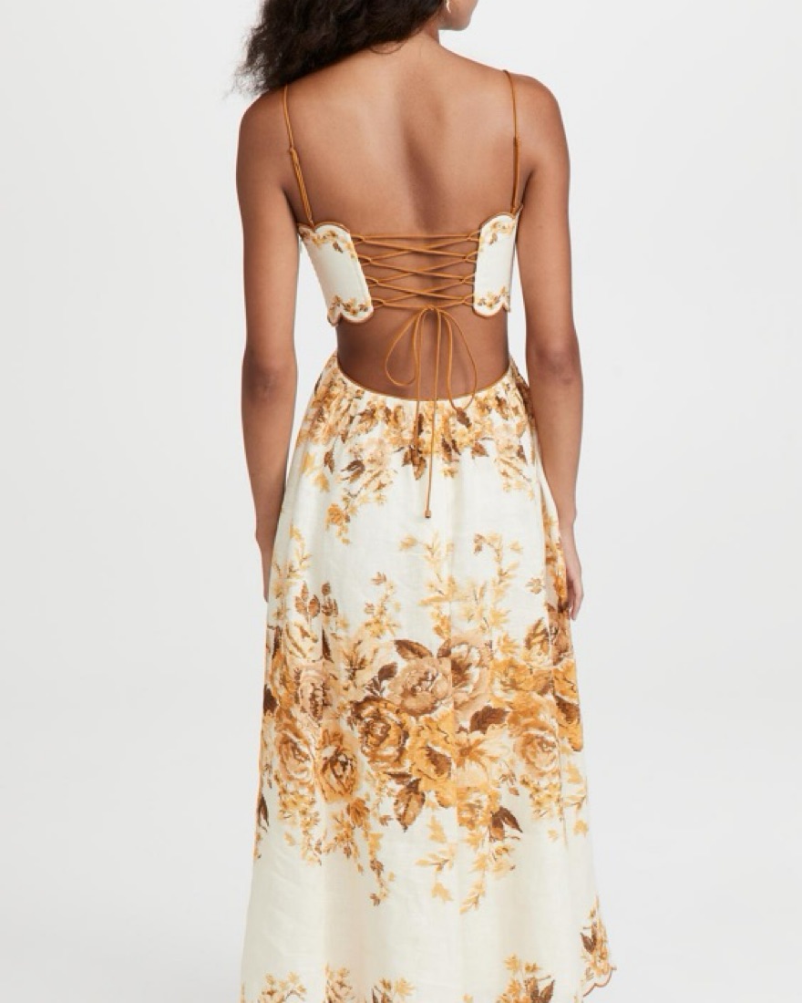 Beautiful yellow floral with corset tie back, size 0 (2-4 US), scalloped midi style