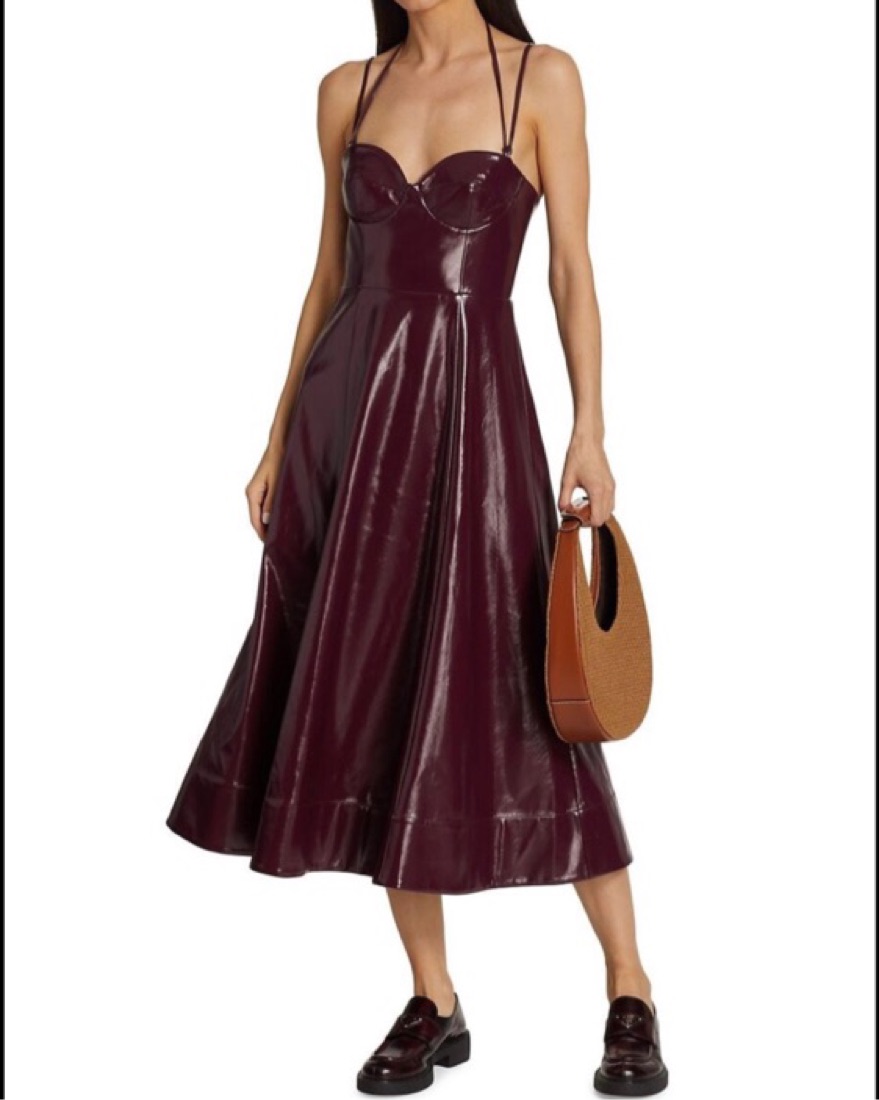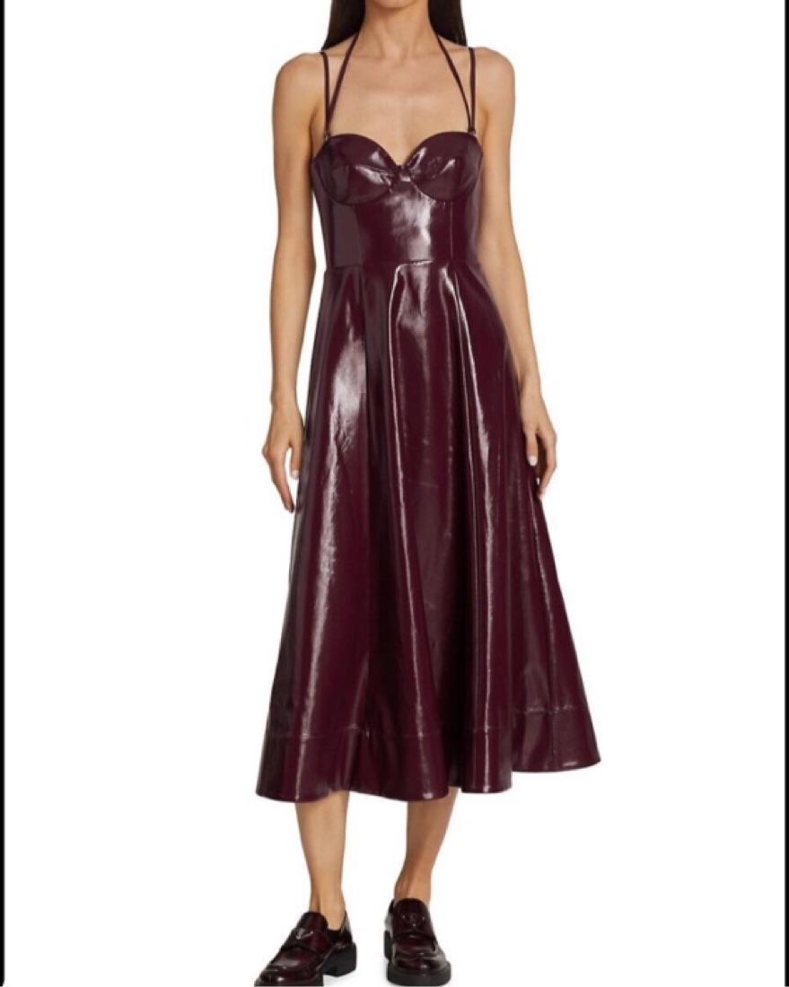 Faux leather dress in plum! Super flattering, corset-like on the top, fits like a glove for size 4. Heavy and feels luxurious. Pair it with flats as shown or elevate it with strappy sandals and tights or full length boots!