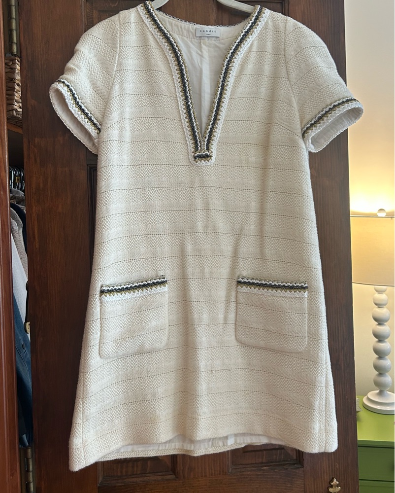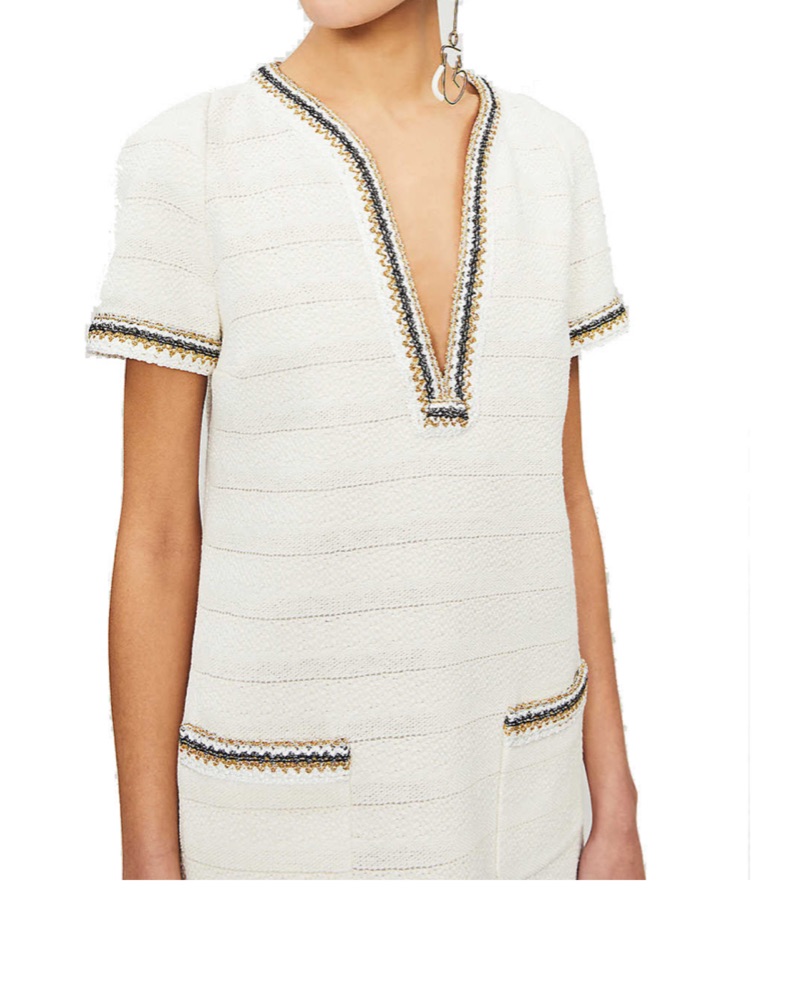 white woven sandro mini dress; deep v; gold and silver detailing